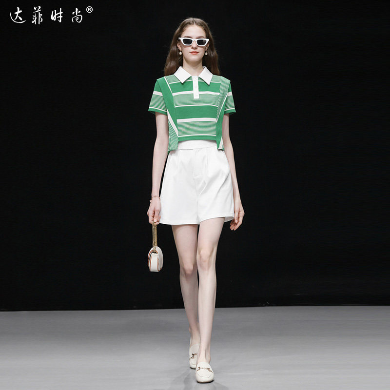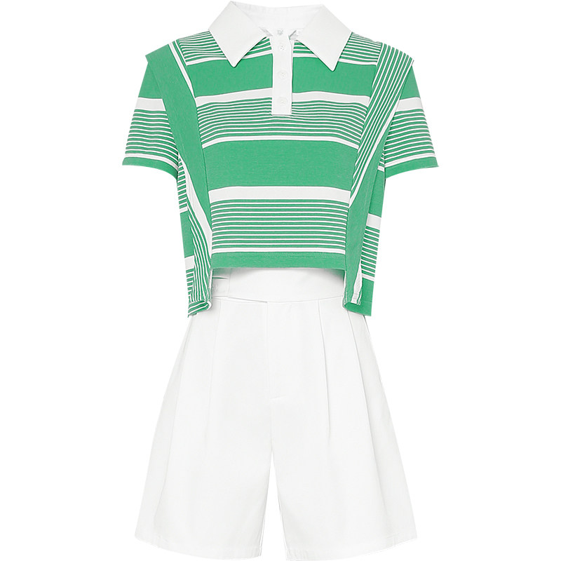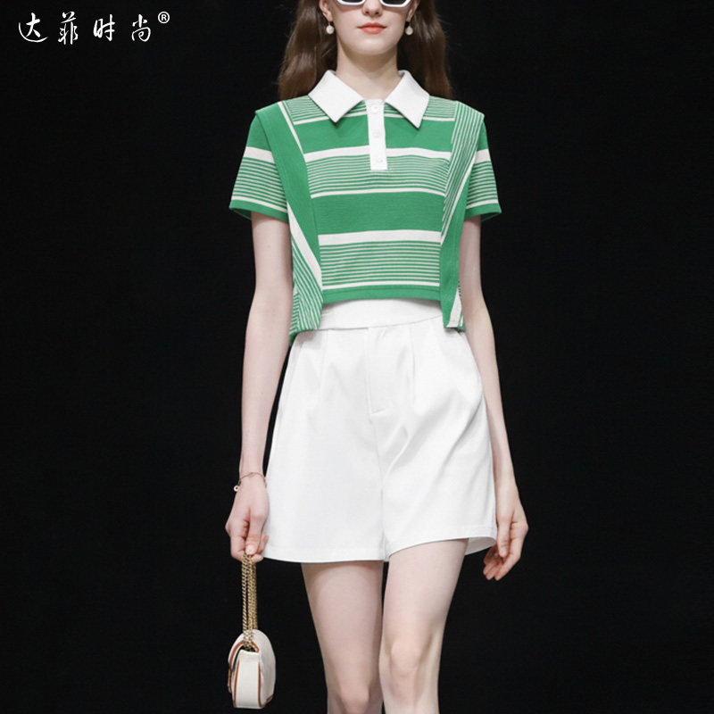 2026夏季新款休闲条纹POLO领T恤短袖上衣高腰百搭白色短裤套装潮