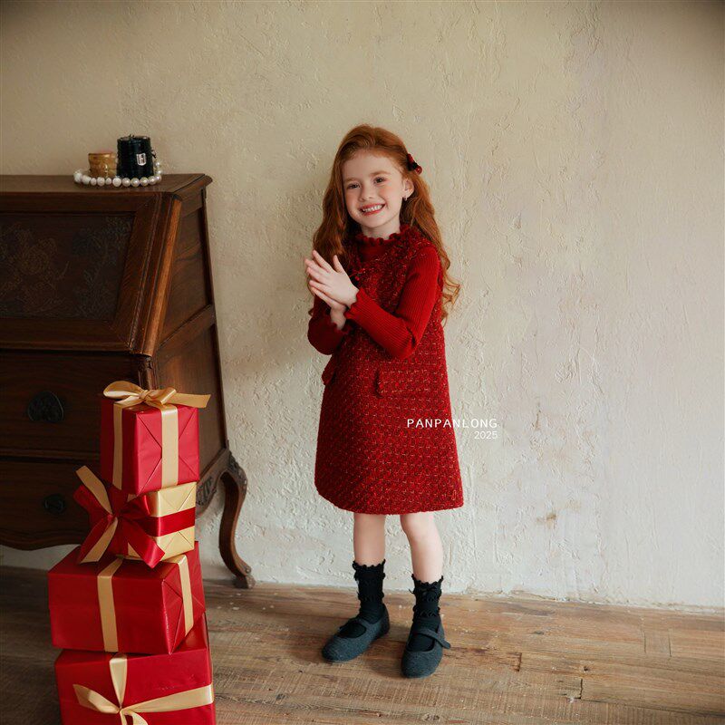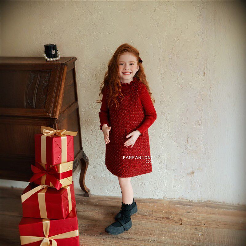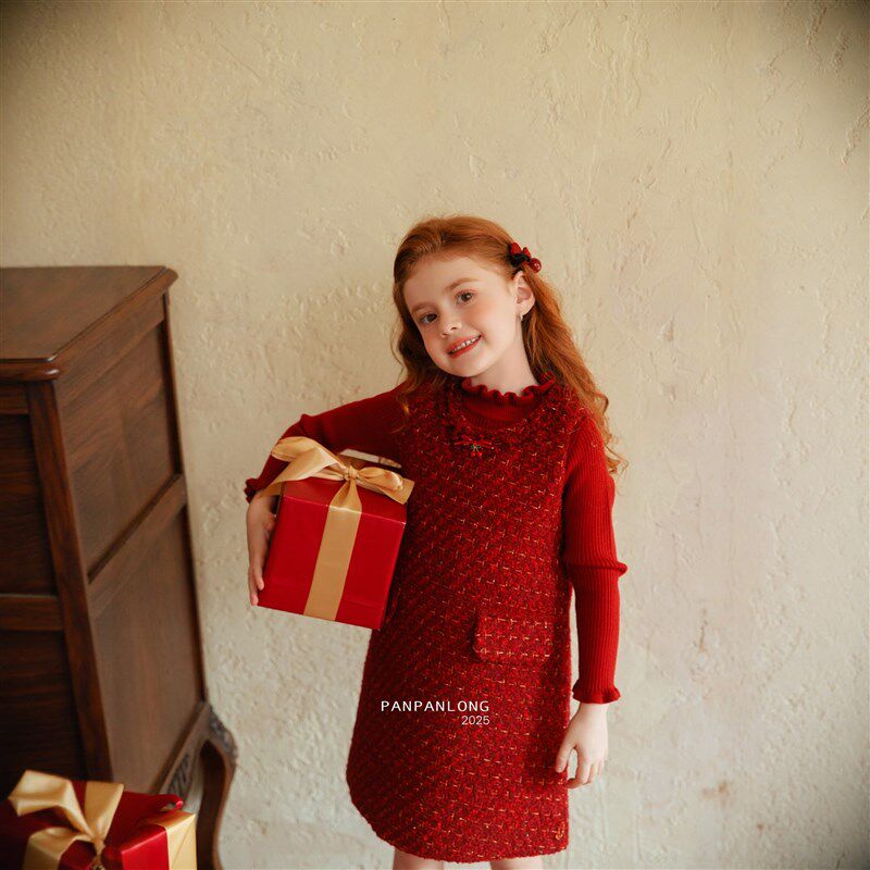 红色毛呢连衣裙25秋冬新款女童圣诞节长袖拜年服新年公主裙A字裙