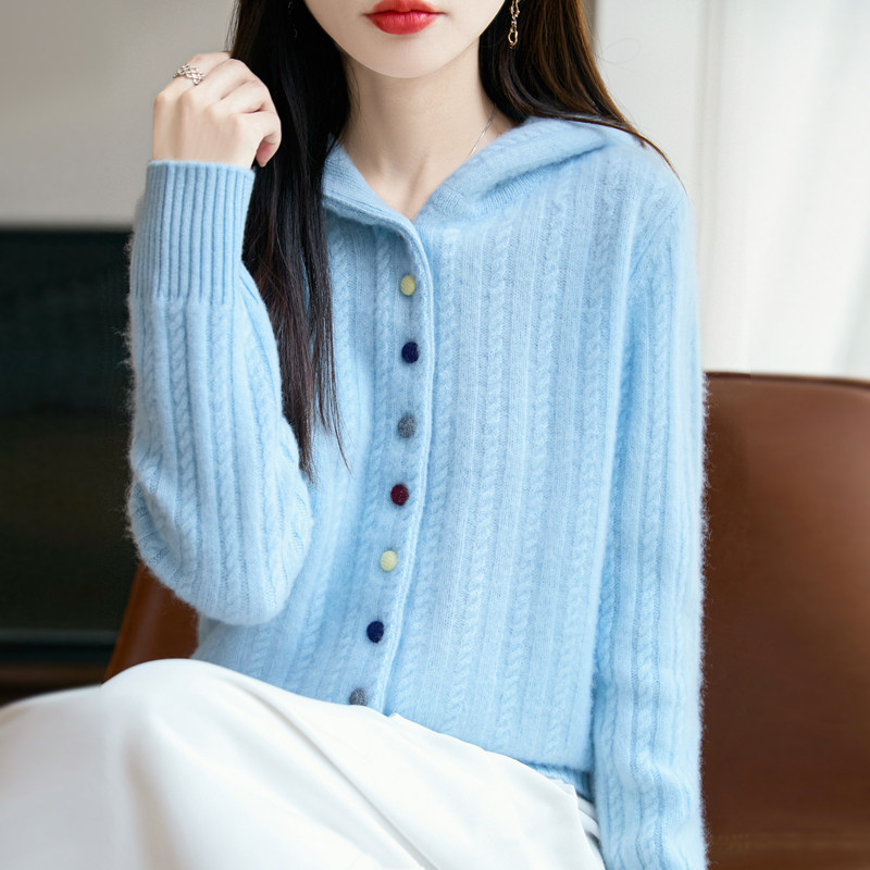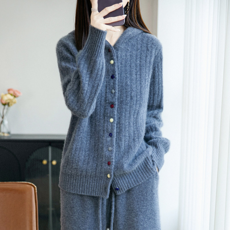 秋冬加厚100%纯羊毛开衫女连帽针织外套宽松毛衣上衣百搭衫外搭