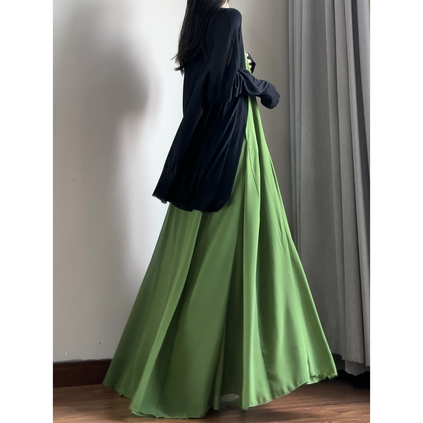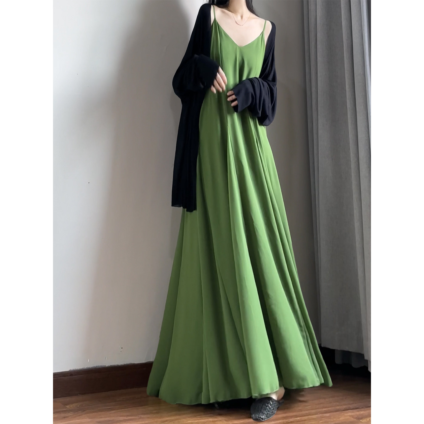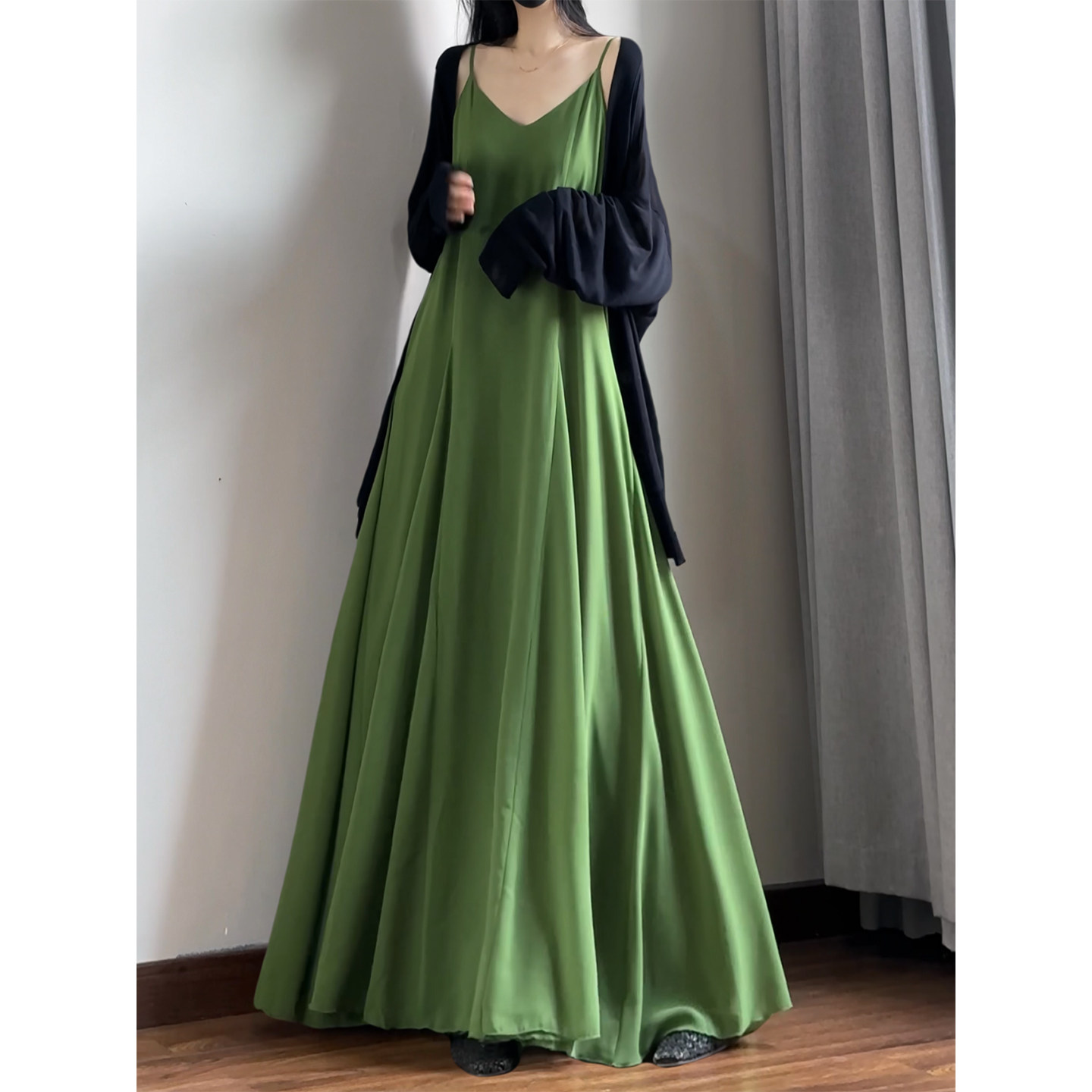 读衣术绿色垂感遮肚子雪纺吊带裙 高个子加长款长裙到脚踝连衣裙