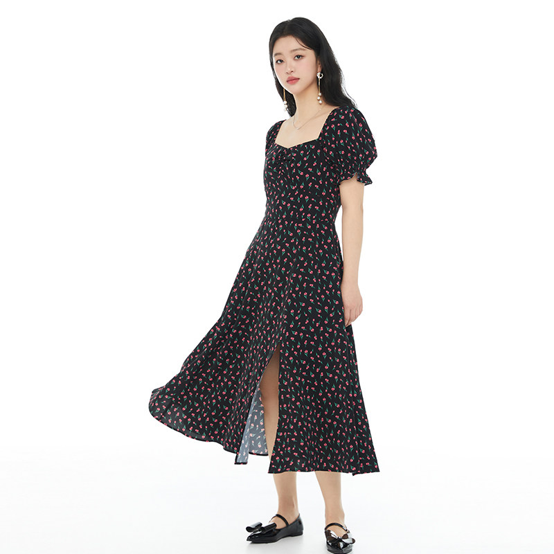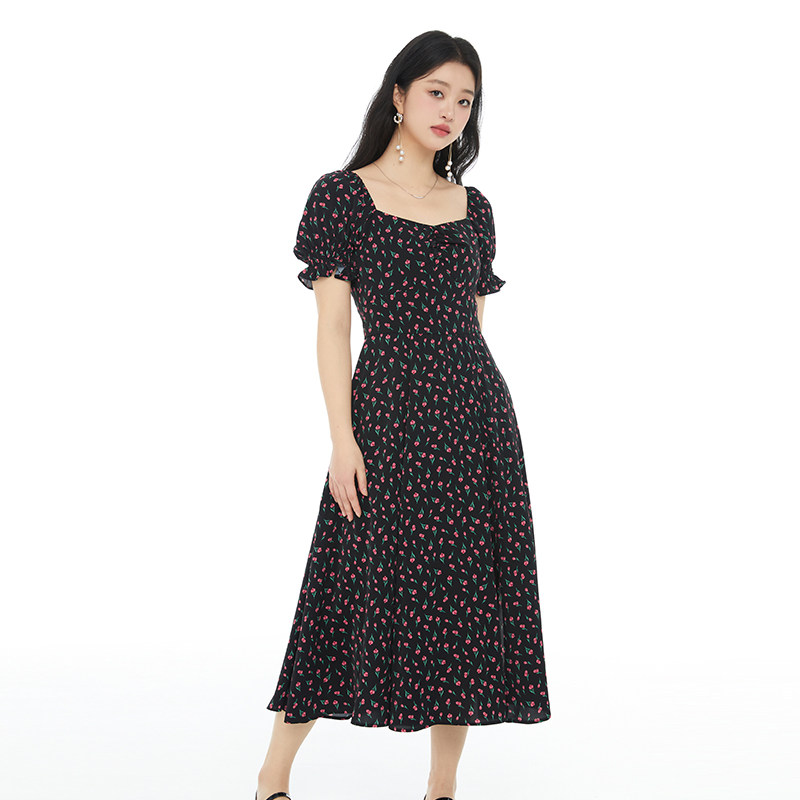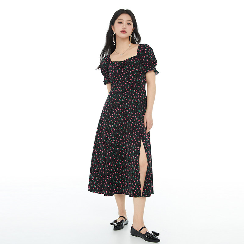 GW大码女装法式碎花方领连衣裙2025夏新款胖mm高腰显瘦遮肚子长裙