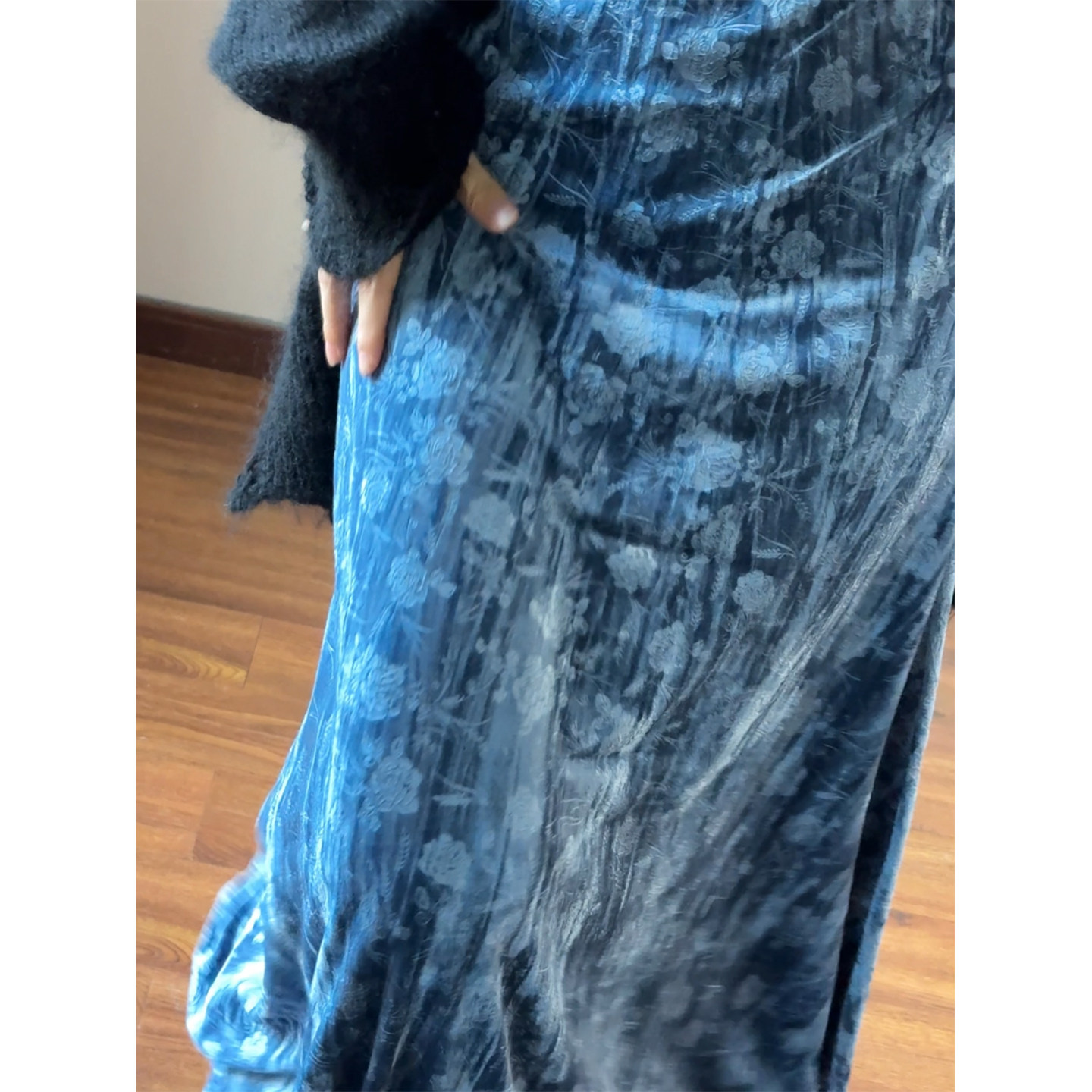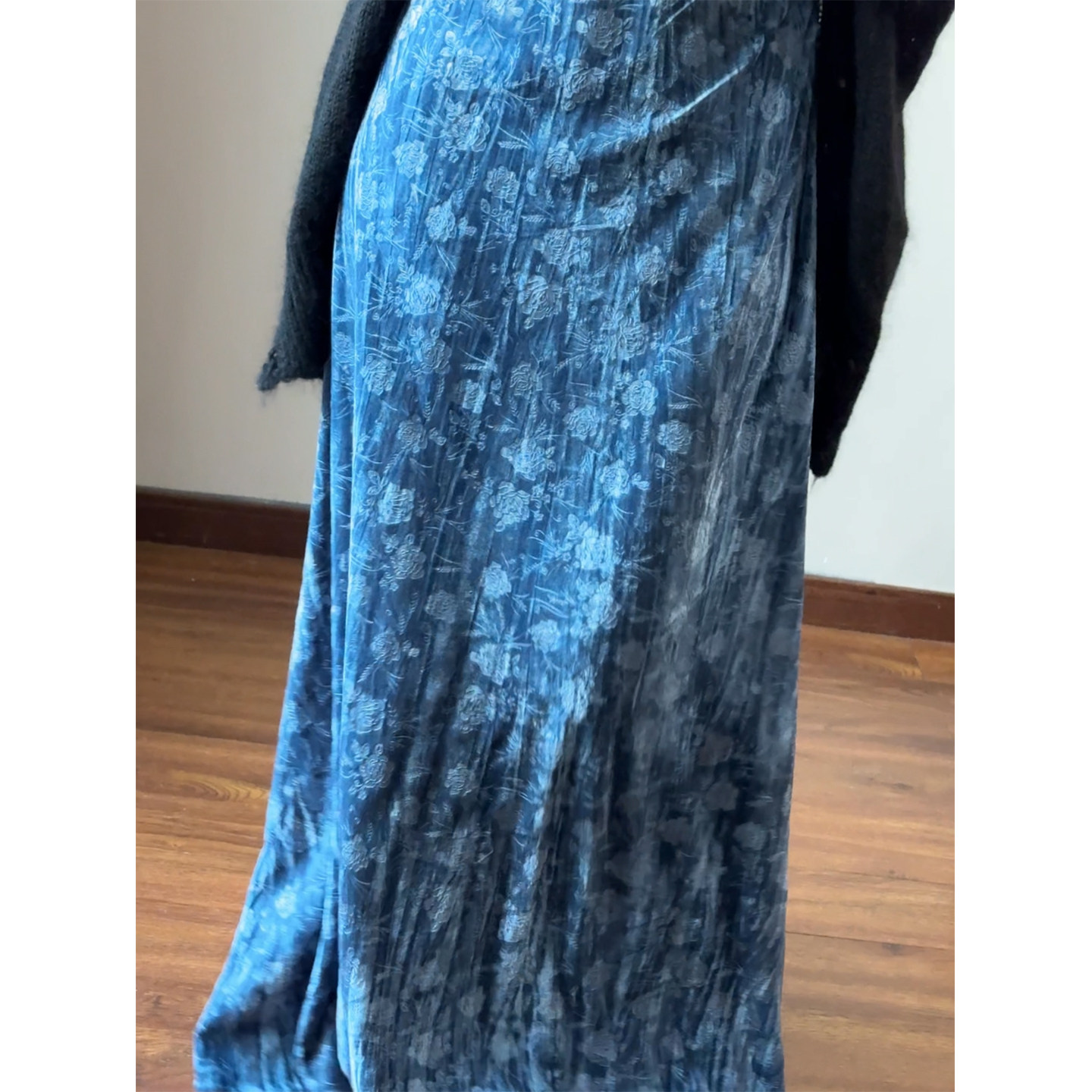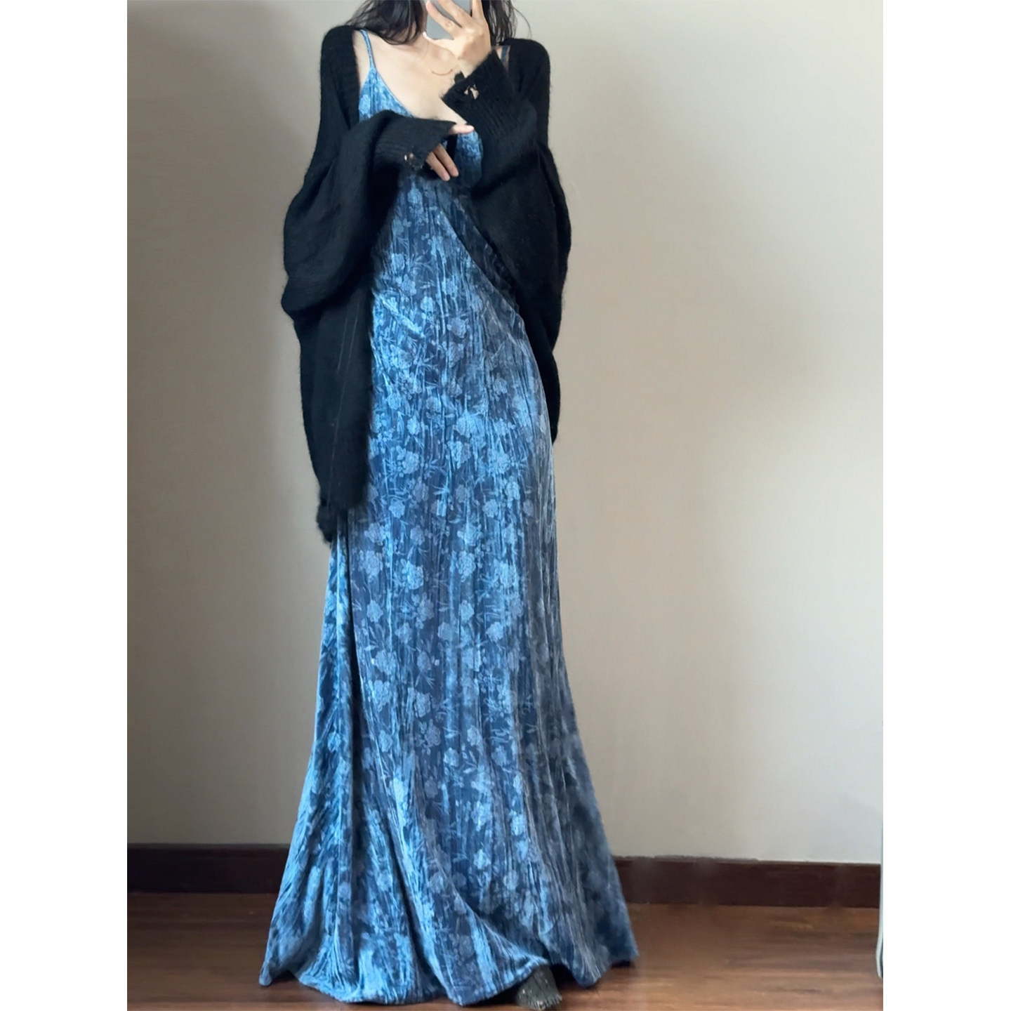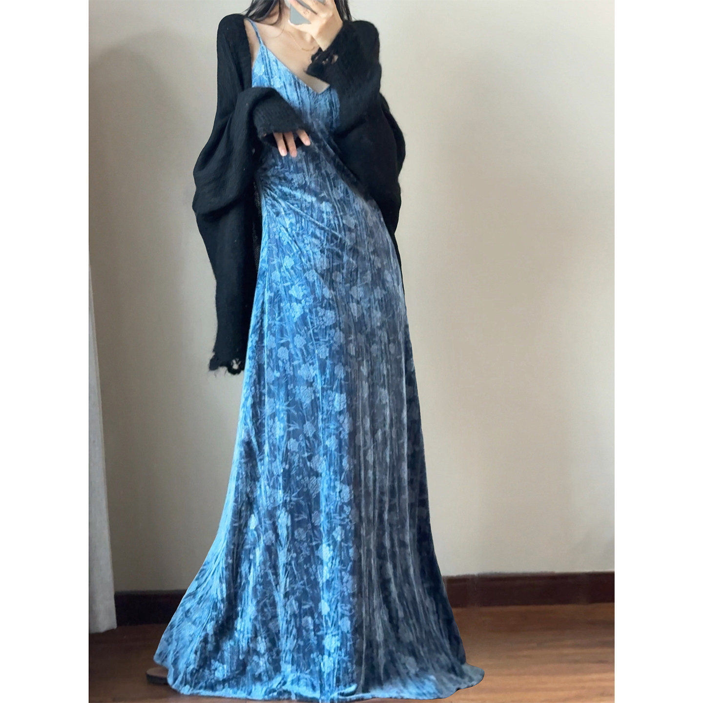 微弹修身复古碎花吊带裙连衣裙秋金丝绒国风收腰显瘦气质长款裙子