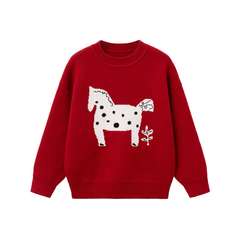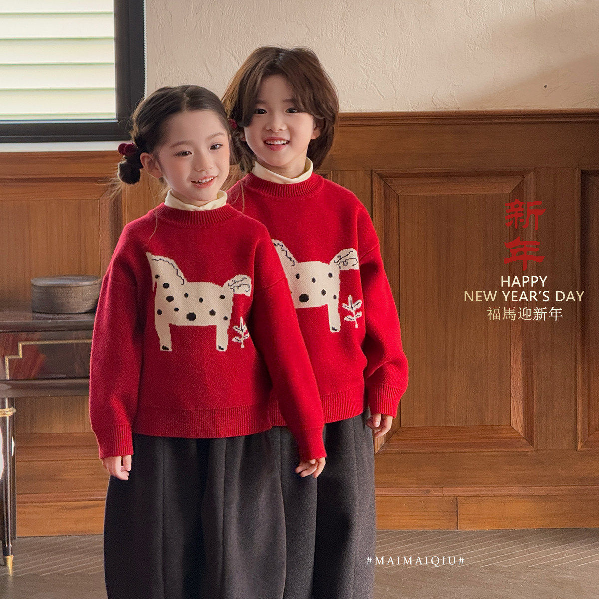 女童毛衣2026新款拜年服男女中大儿童冬季小马超好看提花圆领毛衣