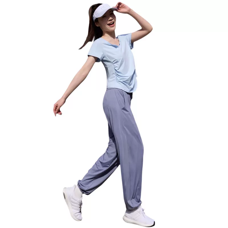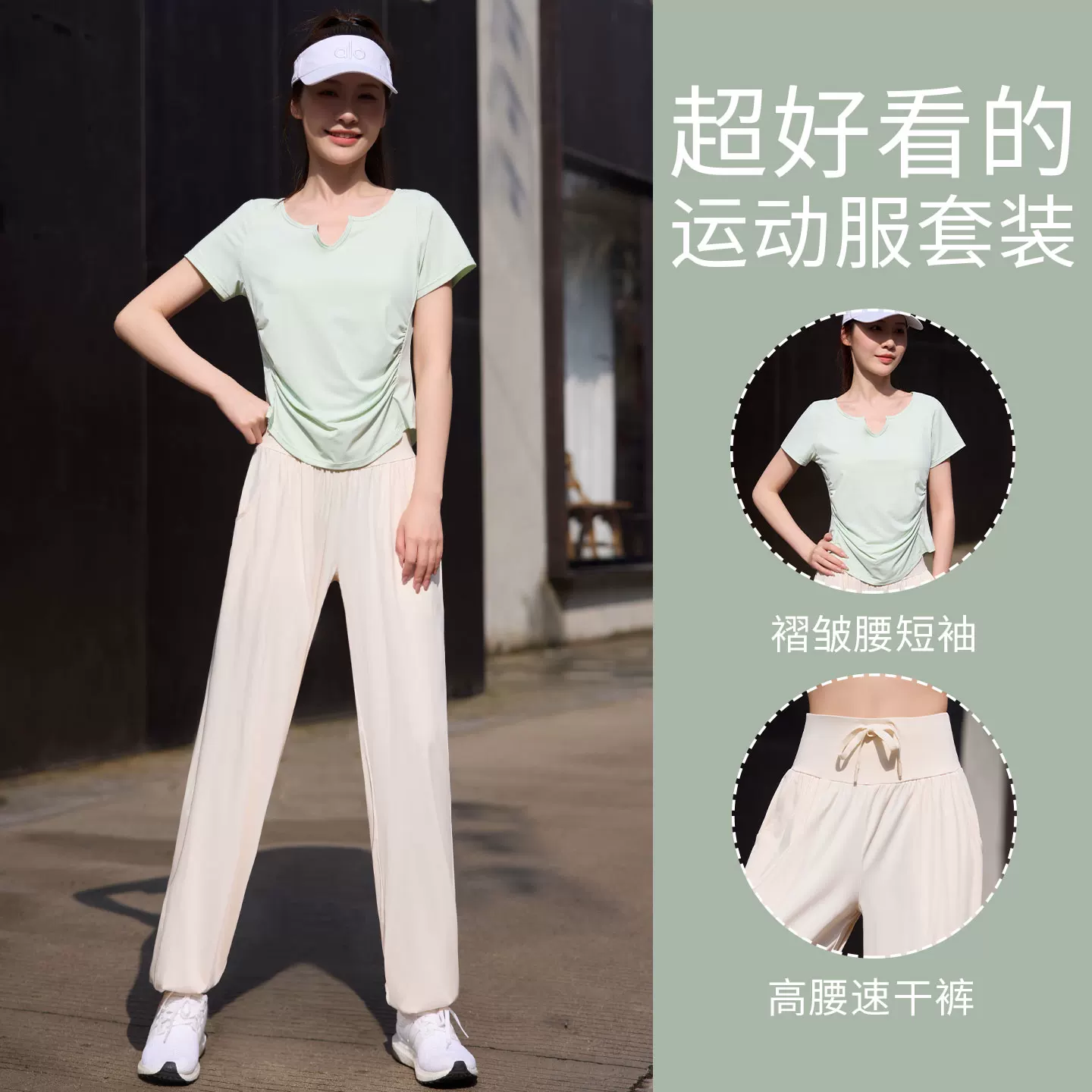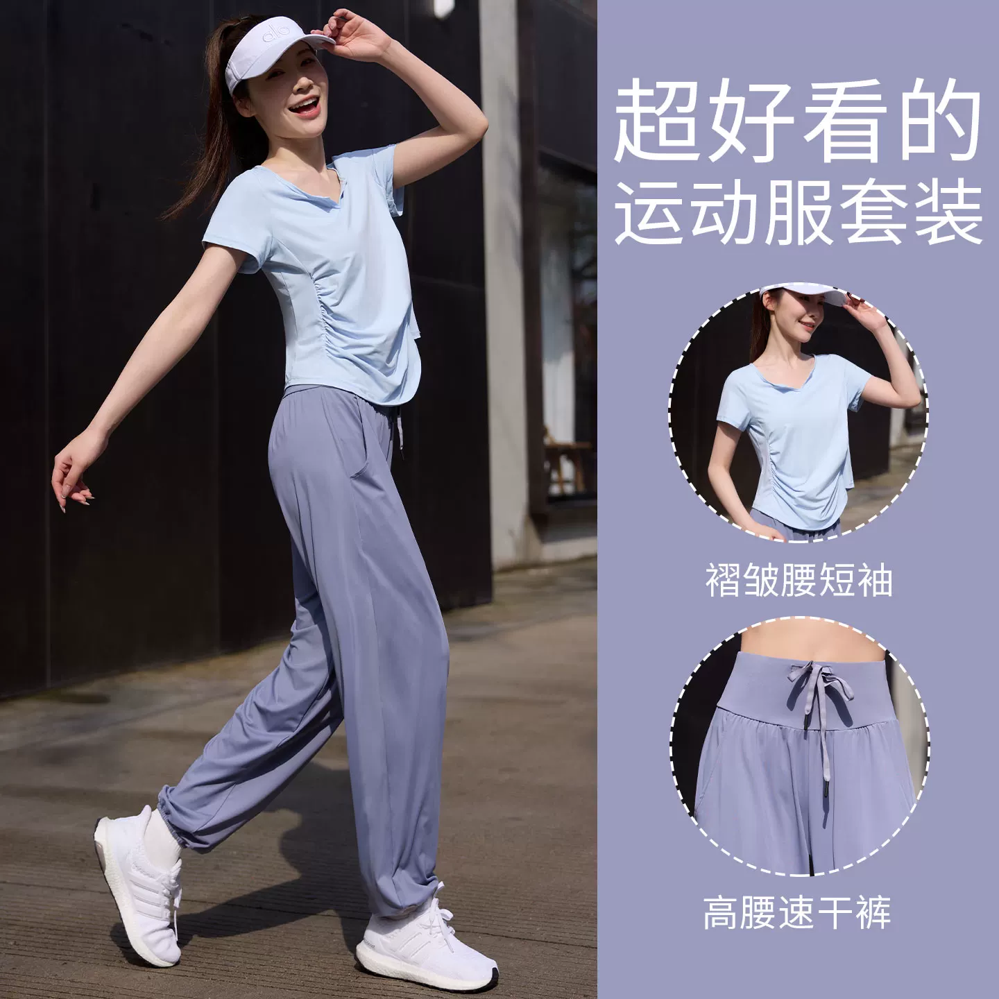 跑步运动套装女夏季薄款宽松瑜伽服上衣健身房训练速干长裤晨跑服