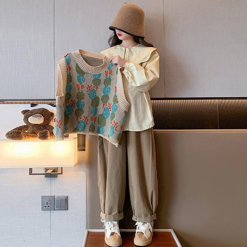 女童套装春秋2025新款洋气女大童装秋装毛衣马甲儿童衬衫三件套