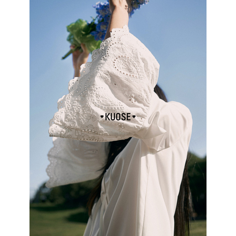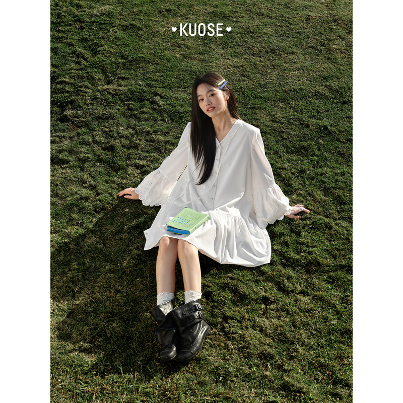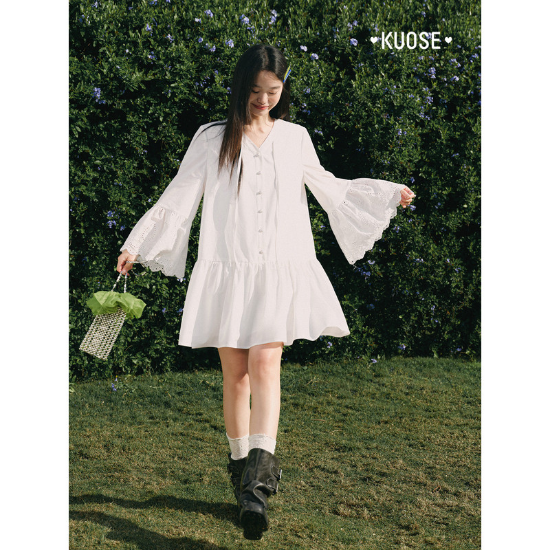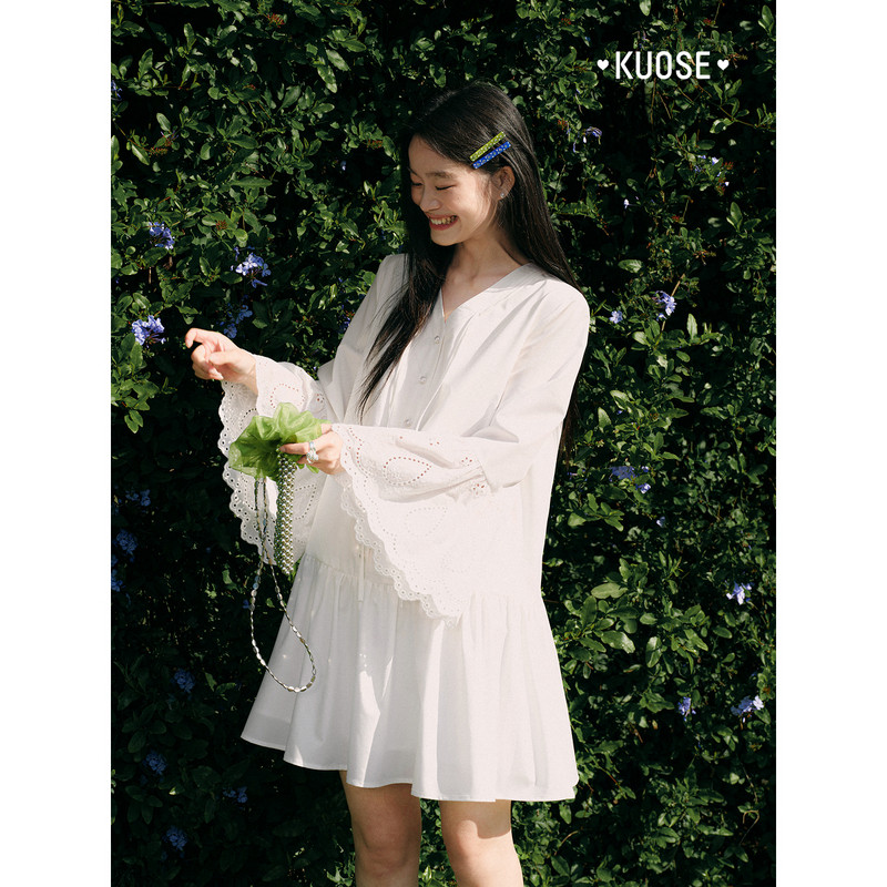 阔色荷叶边镂空刺绣长袖衬衫连衣裙女2026春秋新款法式白色短裙子