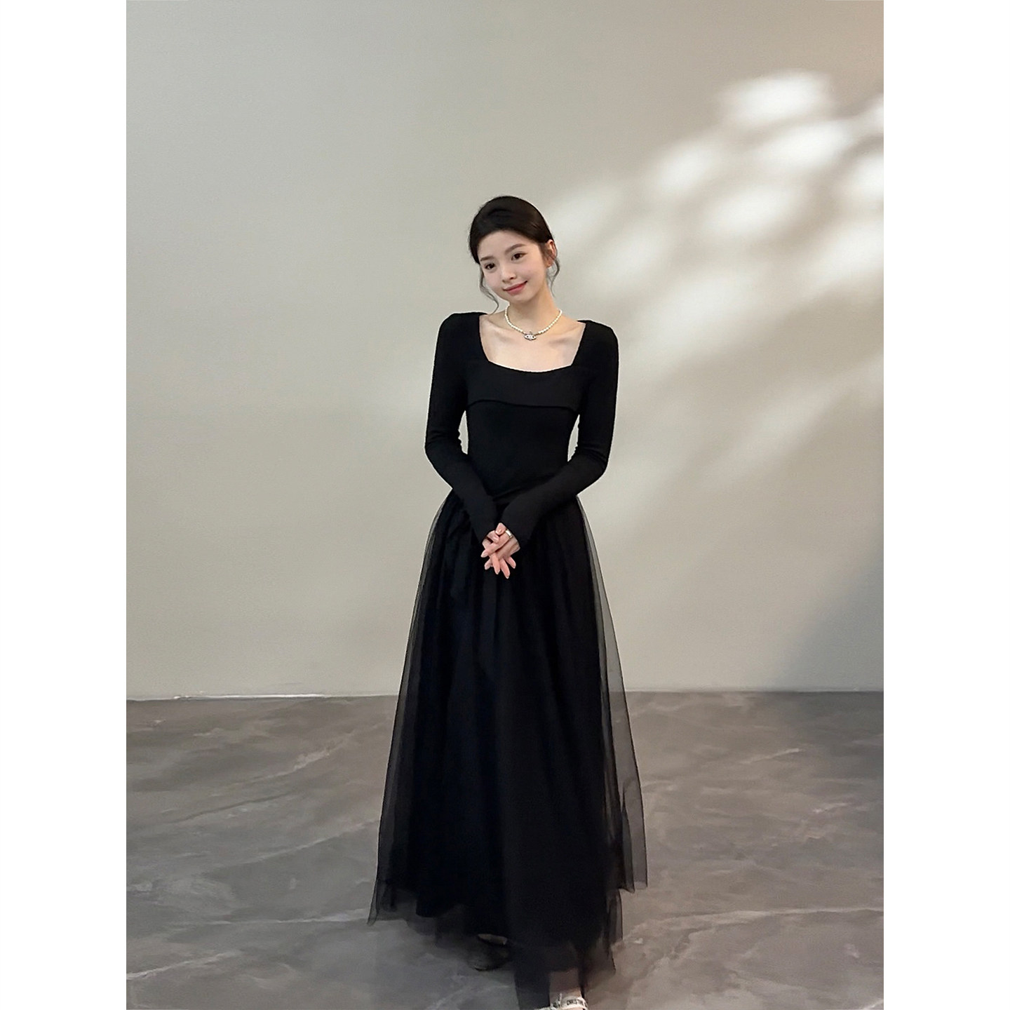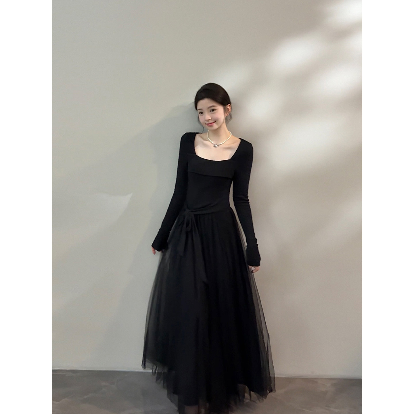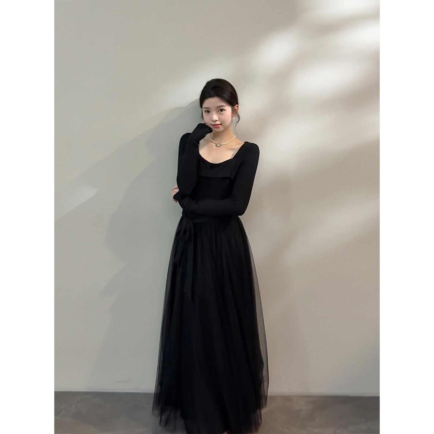 颂宋 秋季长袖黑色法式赫本风掐腰气质蓬蓬网纱连衣裙DT1662