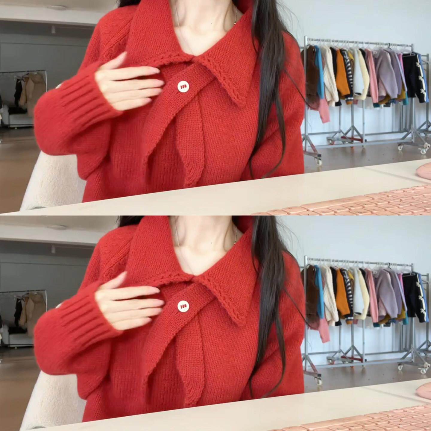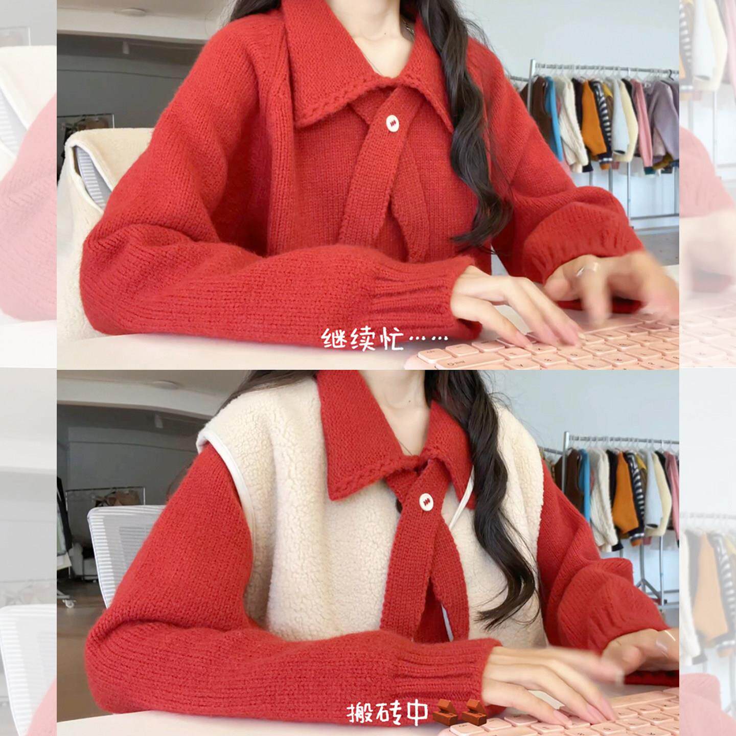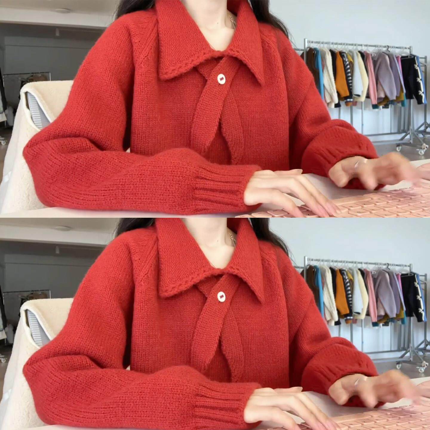 翻领红色毛衣女款2026新款冬季多巴胺新年过年穿搭本命年马年衣服