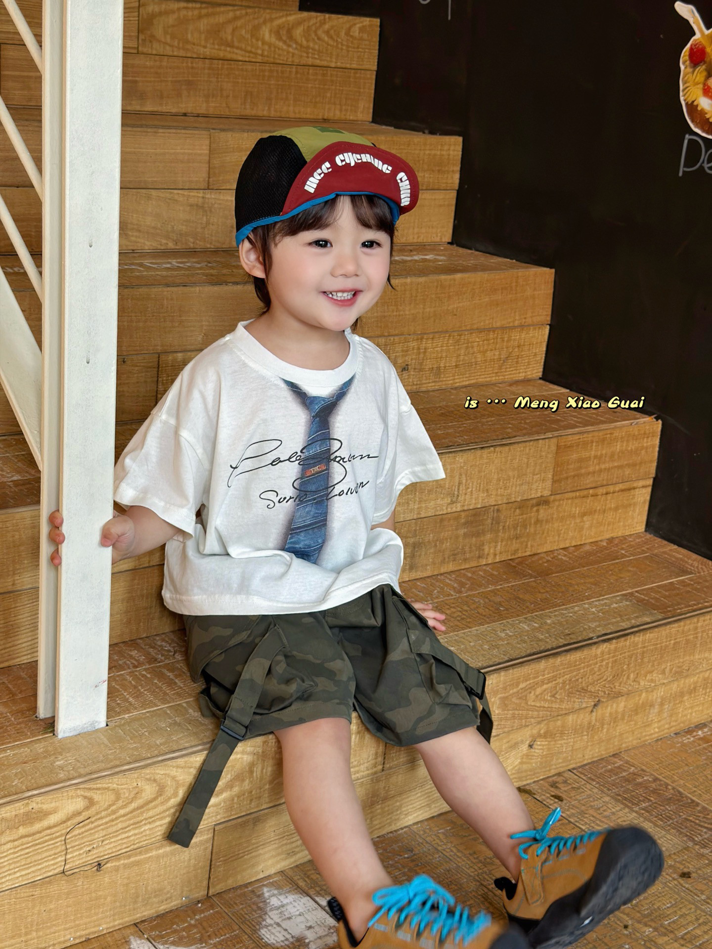 2026夏季新款男童小童潮童领带印花套头短袖T恤衫迷彩短裤套装