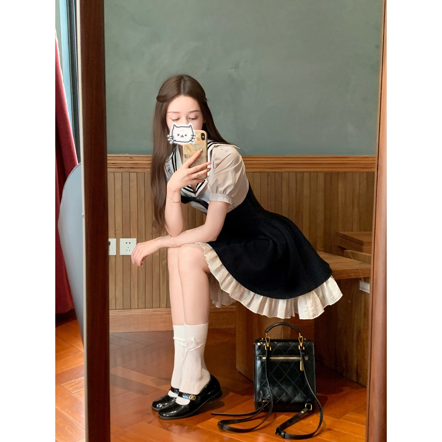 桃可了《自习室》日系海军风泡泡袖收腰连衣裙女显瘦减龄短款裙子