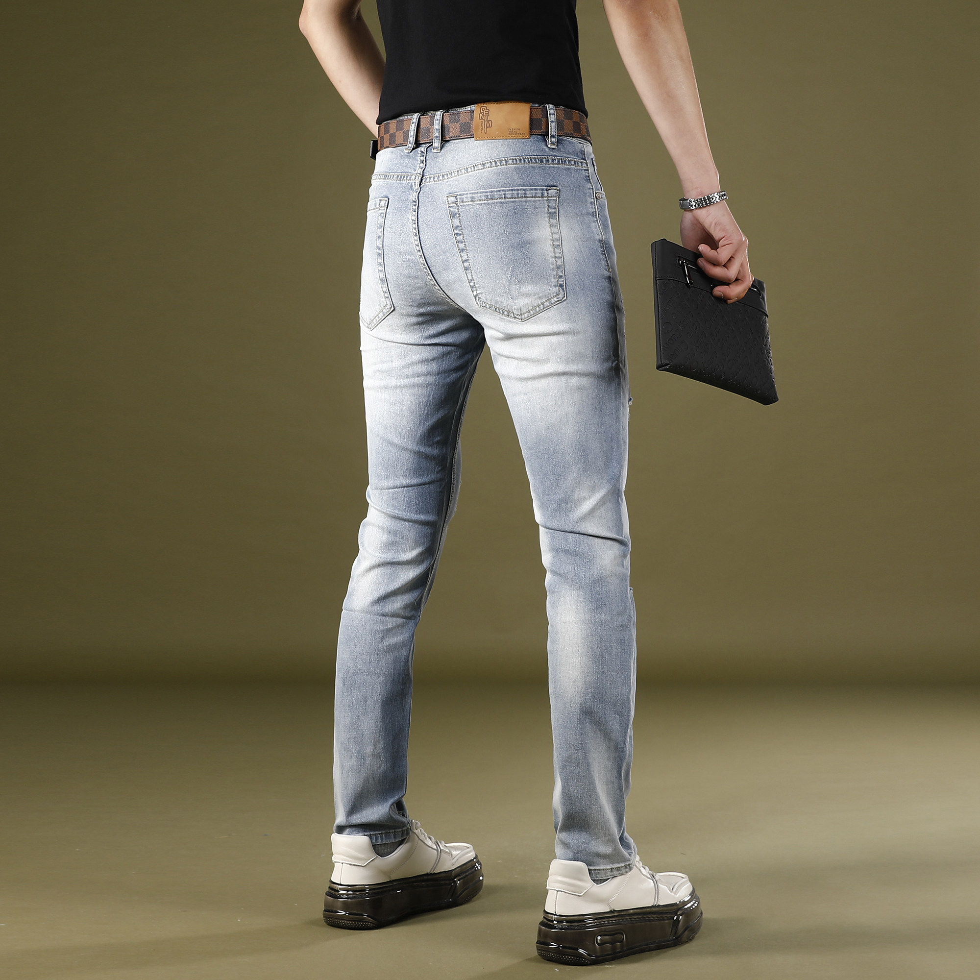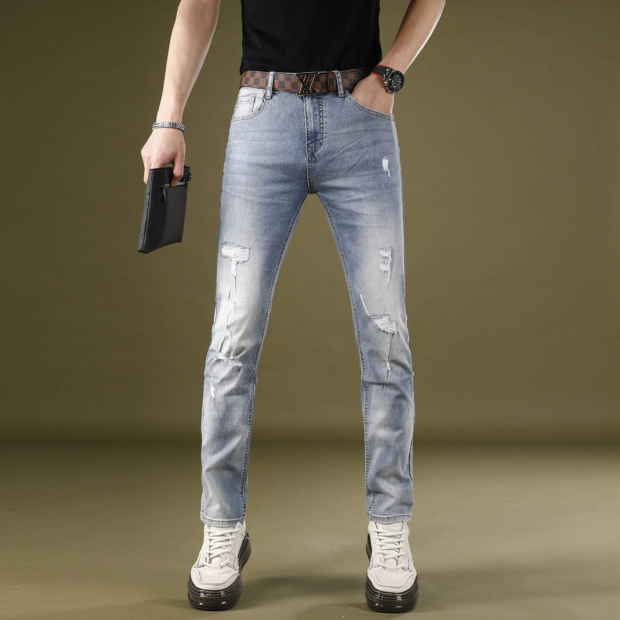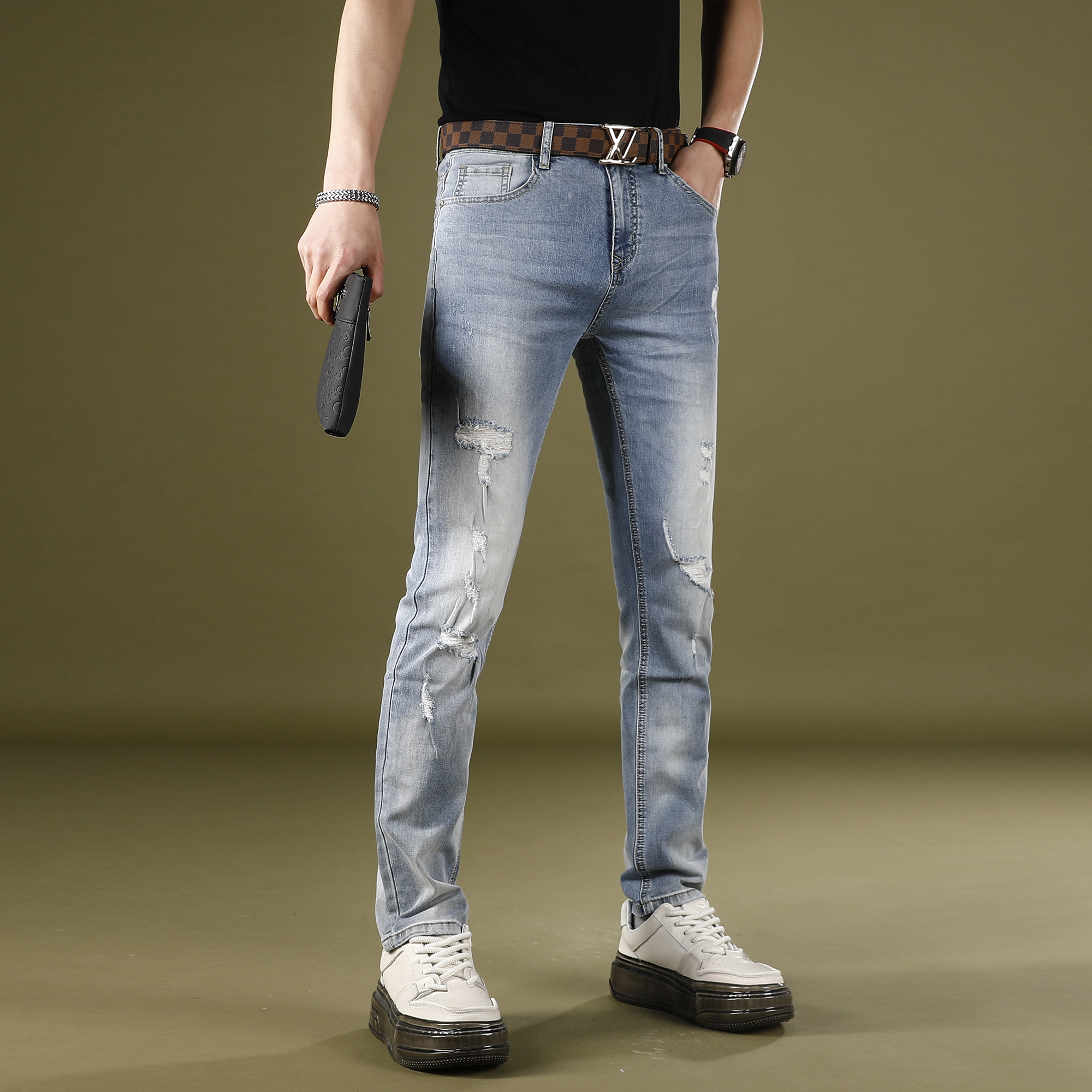 夏季破洞牛仔裤男款2026新款修身小直筒薄浅蓝色休闲弹力男士裤子