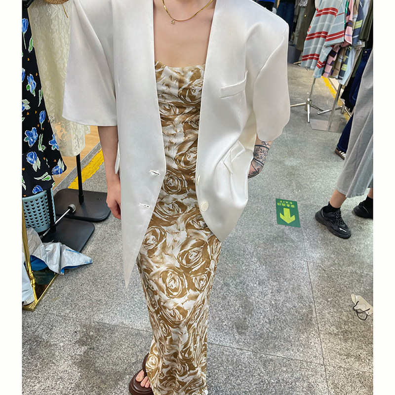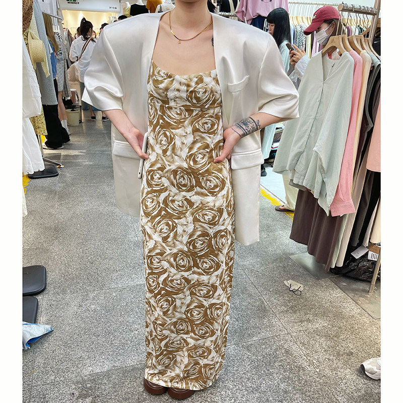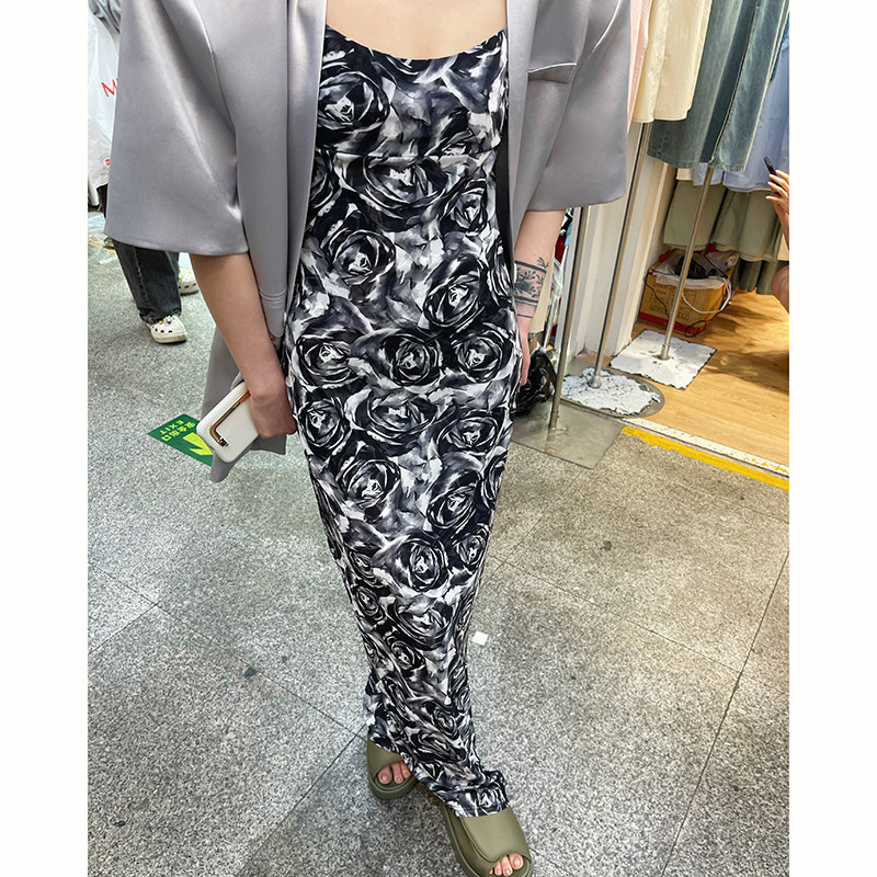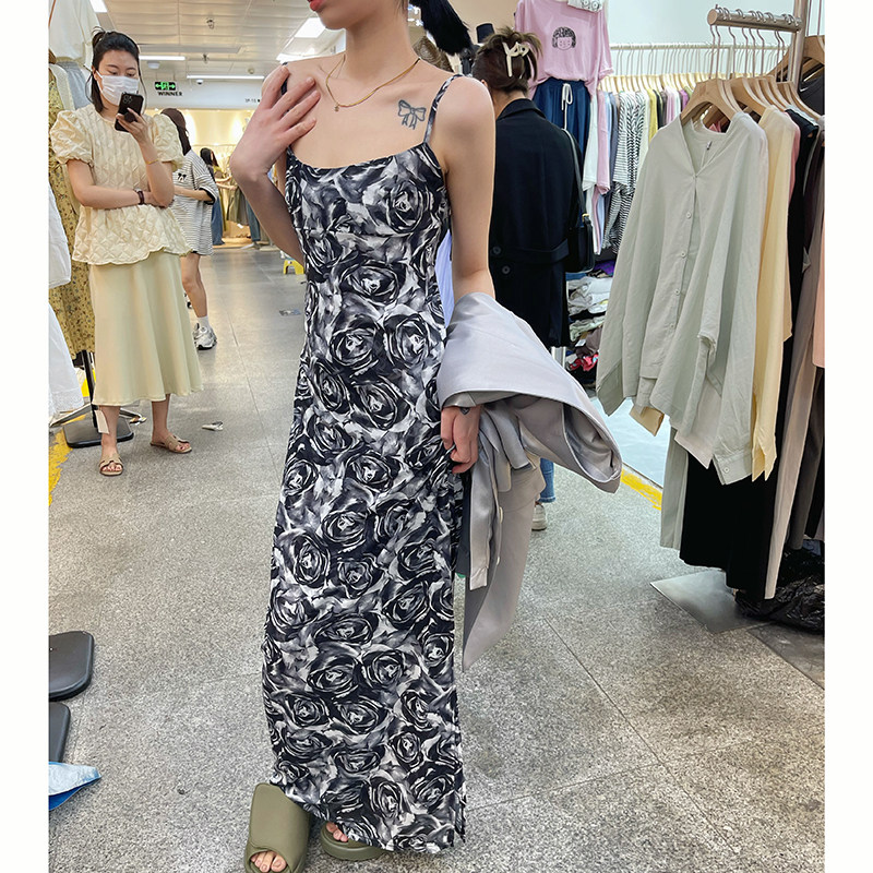 玫瑰花吊带连衣裙女高级感收腰中长款宽松法式复古夏季a字裙长裙