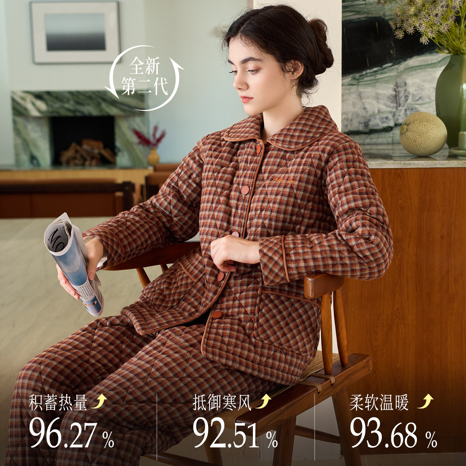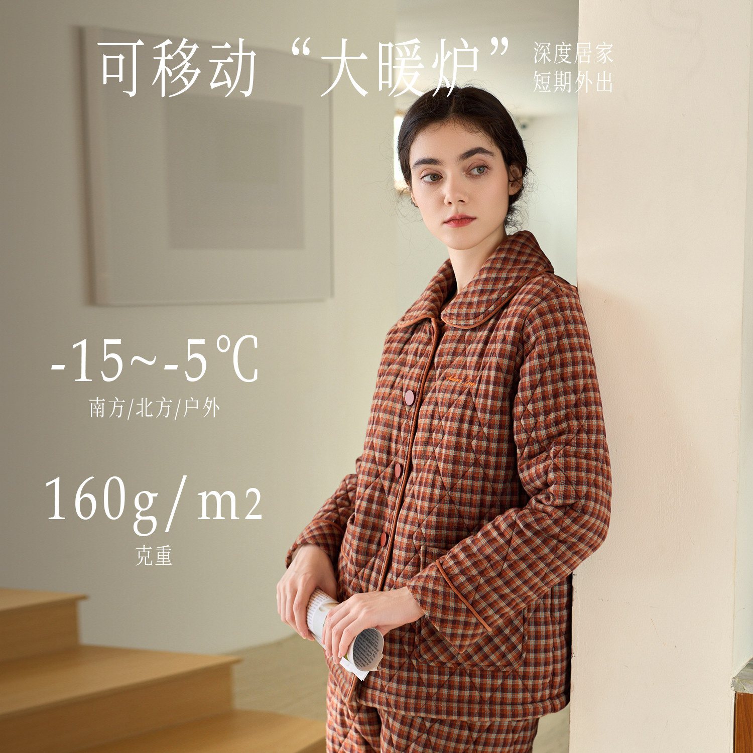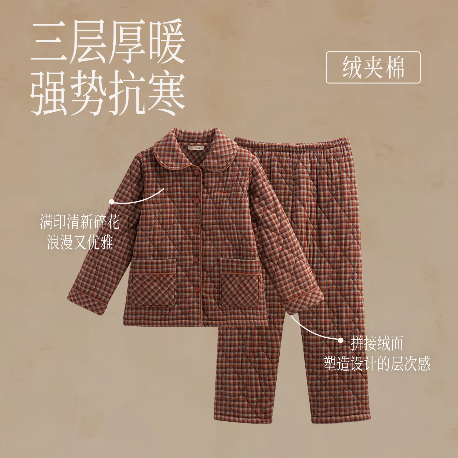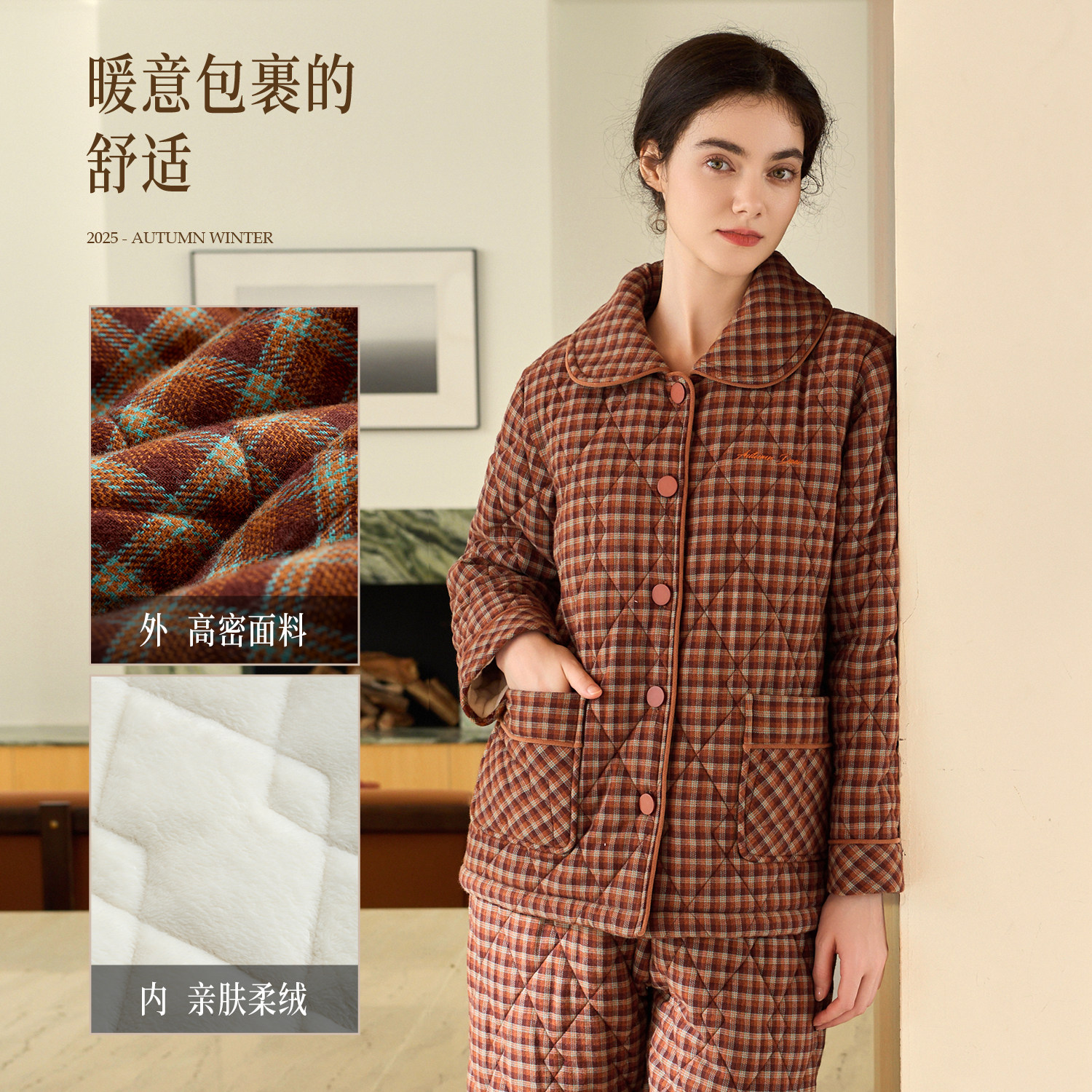 秋鹿梭织色织格三夹棉睡衣女款秋冬季纯棉加厚保暖扣领家居服套装