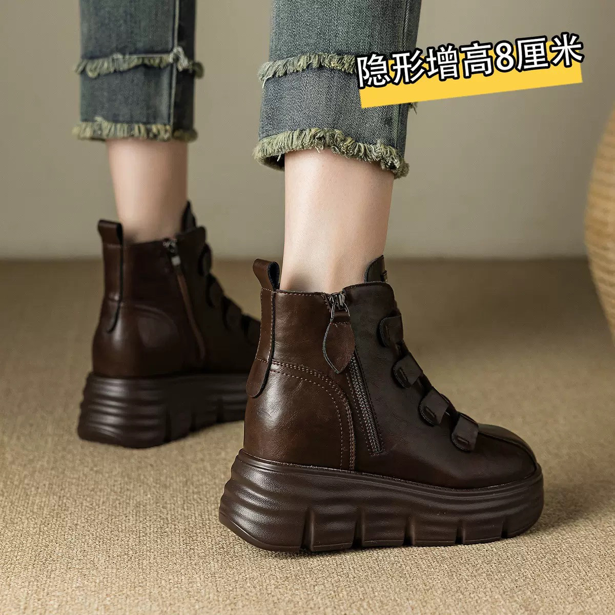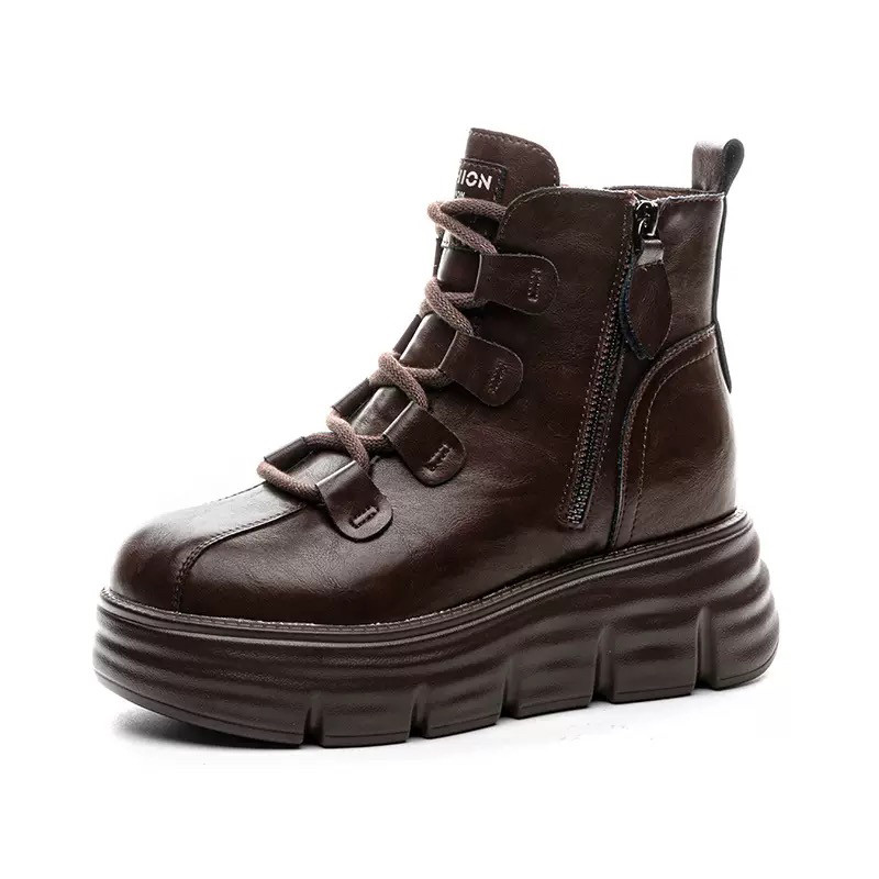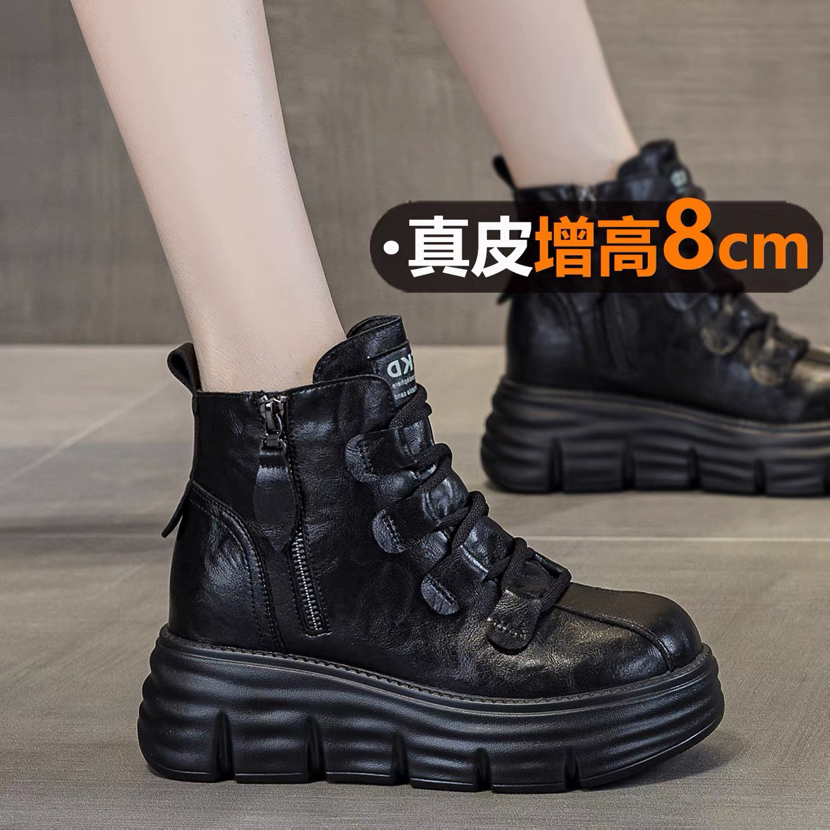 真皮厚底马丁靴女款2025新款秋冬季内增高8cm小个子复古软底短靴