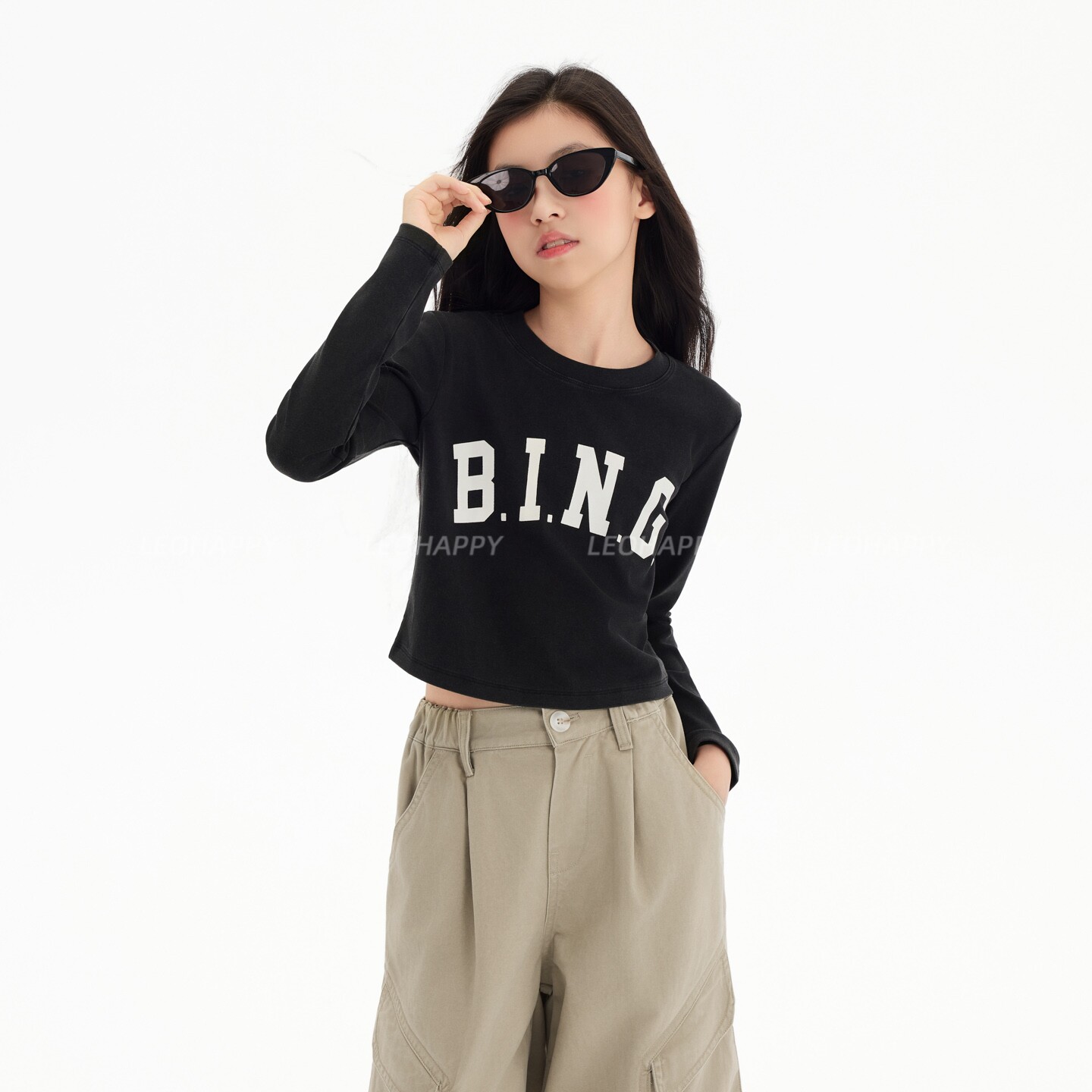 LEOHAPPY女童长袖t恤纯棉儿童打底衫女孩T恤中大童百搭上衣短款