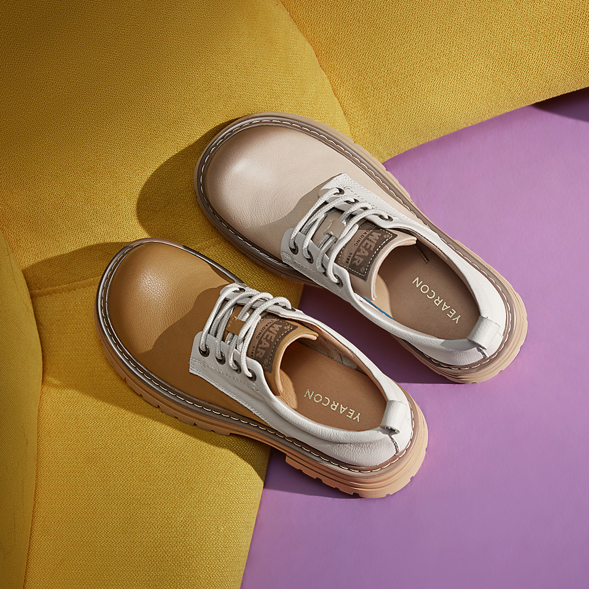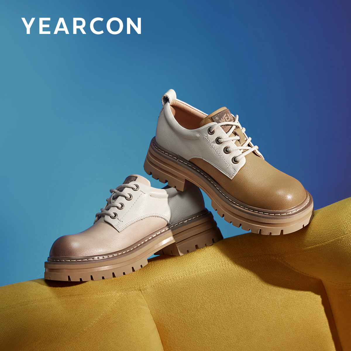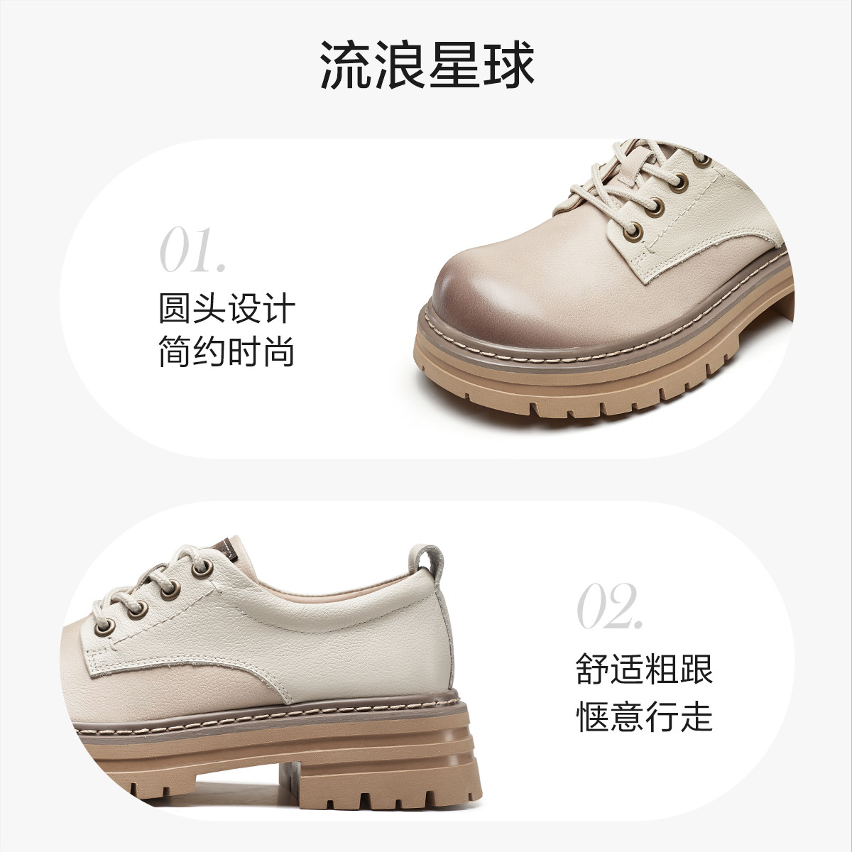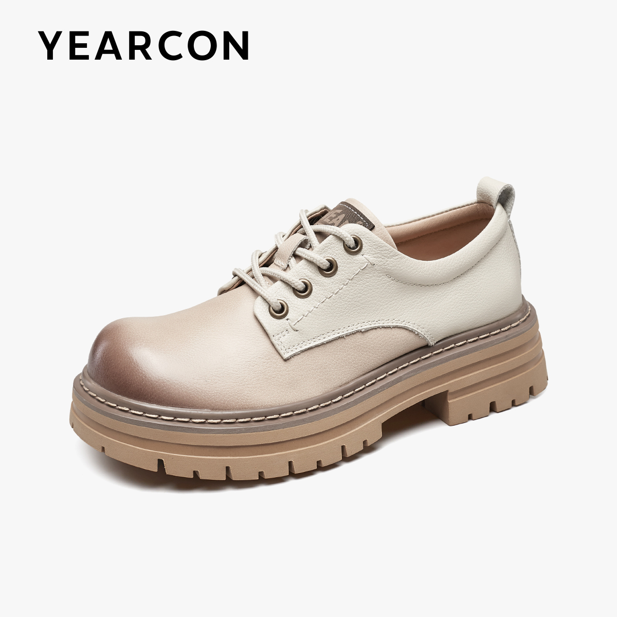 意尔康春款复古真皮单鞋女牛皮拼接厚底深口英伦风工装小皮鞋