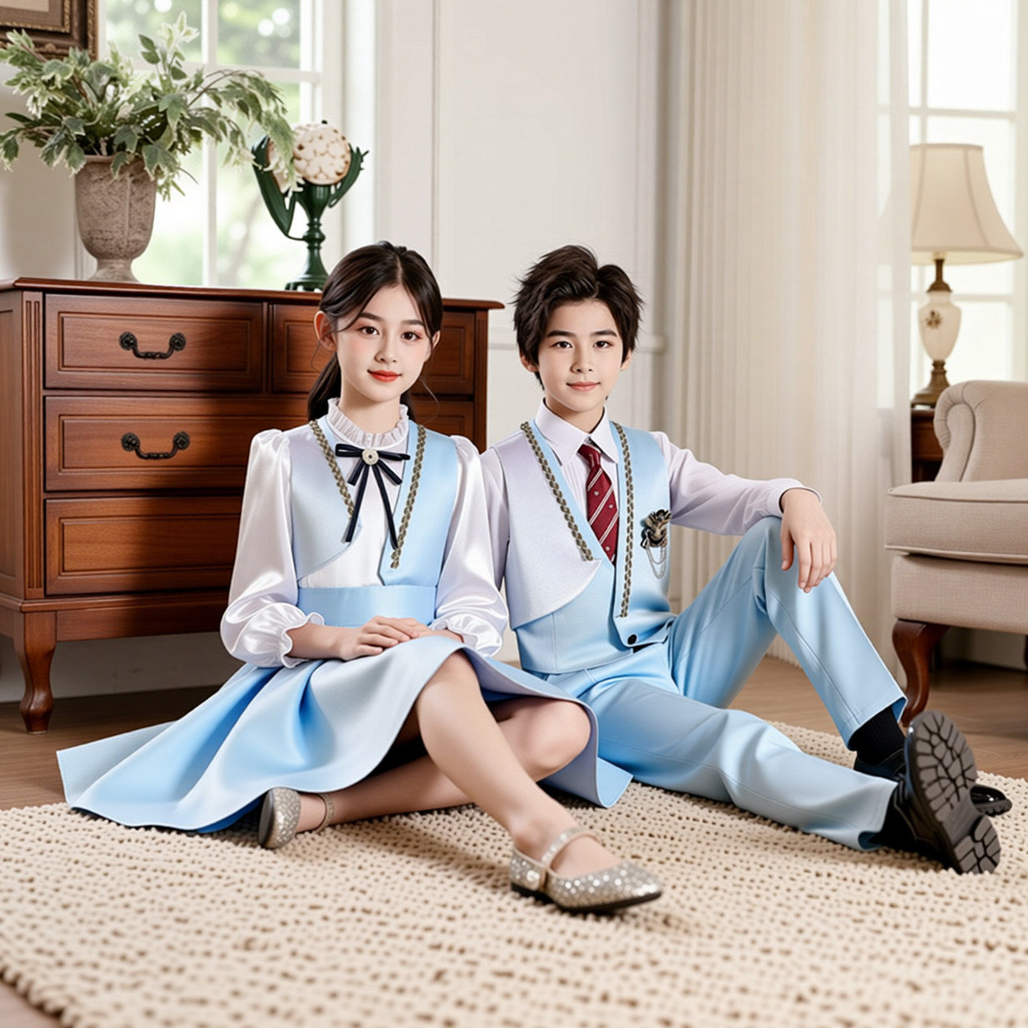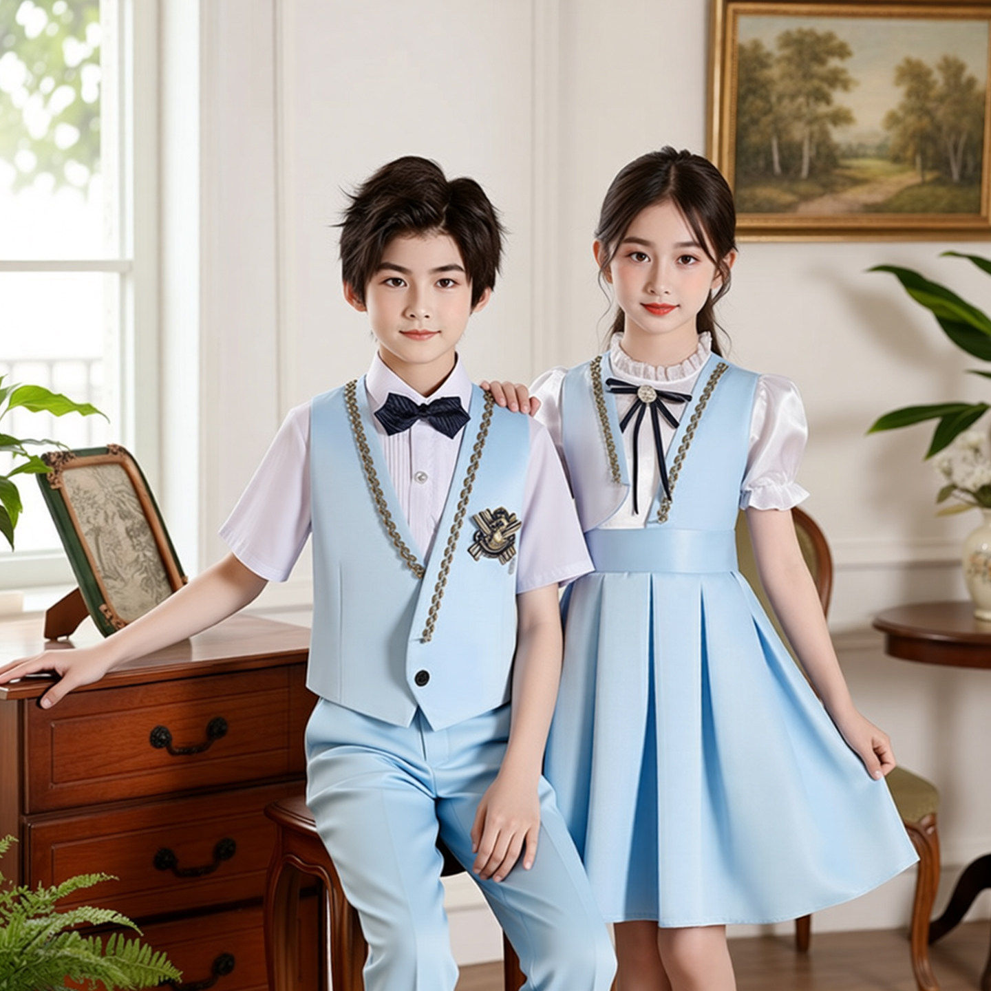 儿童合唱朗诵演出服初中小学生女童蓝色学院风口才演讲比赛礼服装