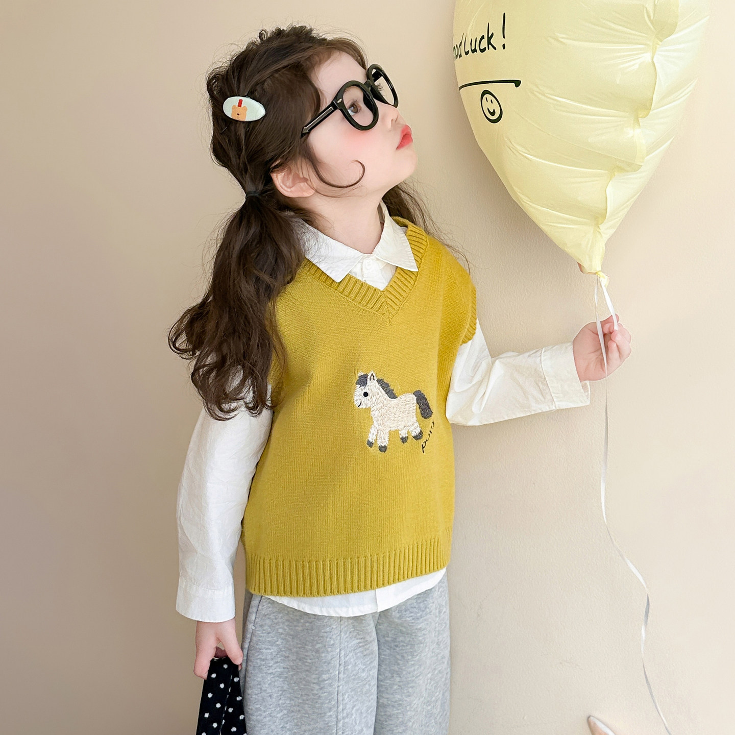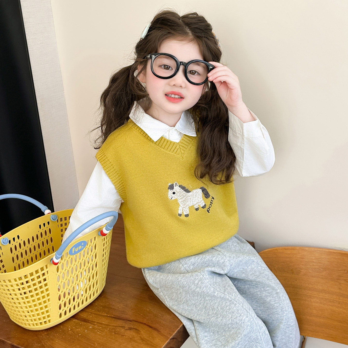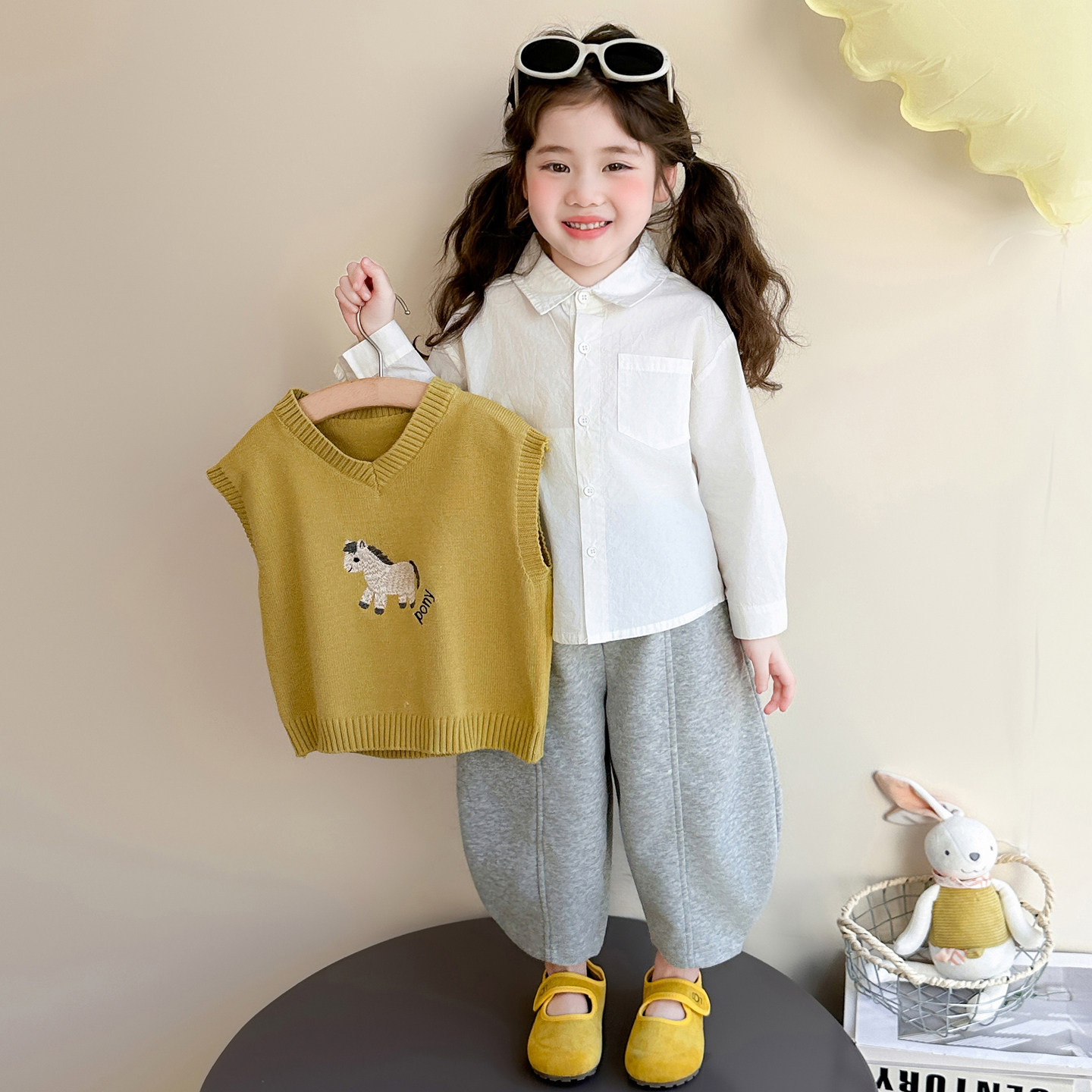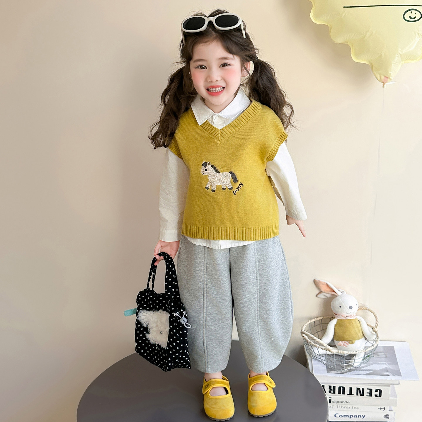 女童马年春秋套装毛衣马甲衬衫裤子三件套小马刺绣超可爱时髦穿搭