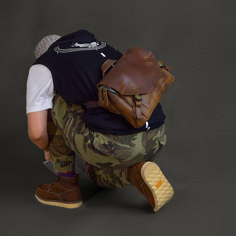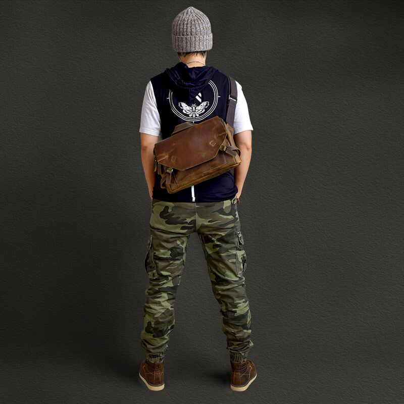 二十四街 新款复古潮流疯马皮男士斜挎包牛皮青年咔叽风机车包
