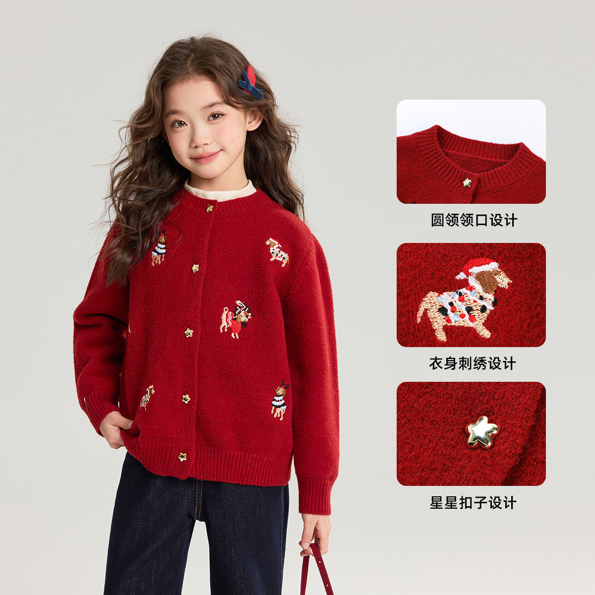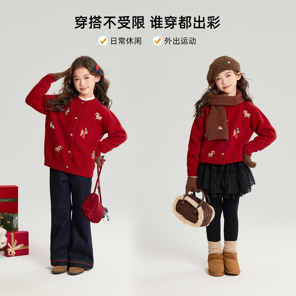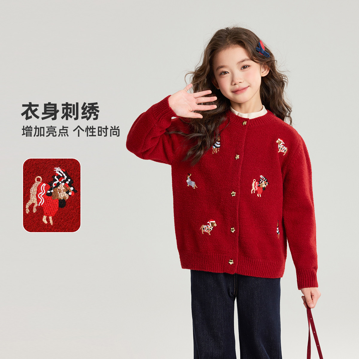 布丁哈鲁冬装女童童装2026秋冬季新款儿童新年红色刺绣毛衣开衫