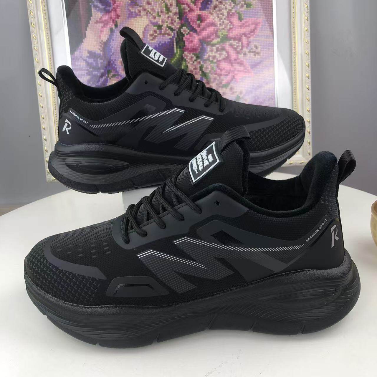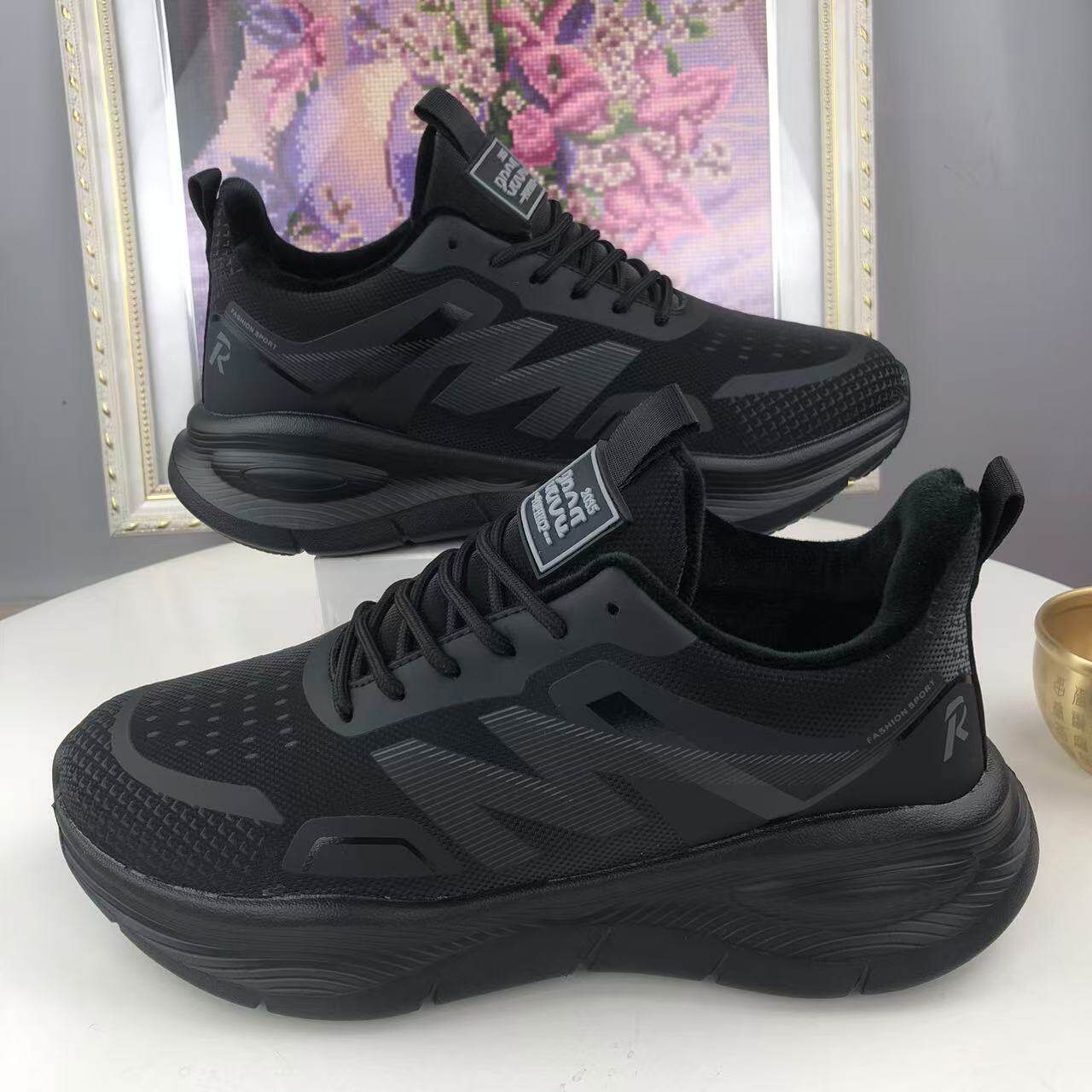 冬季棉鞋子男款加绒加厚运动休闲鞋黑色皮面保暖跑步鞋轻底爸爸鞋