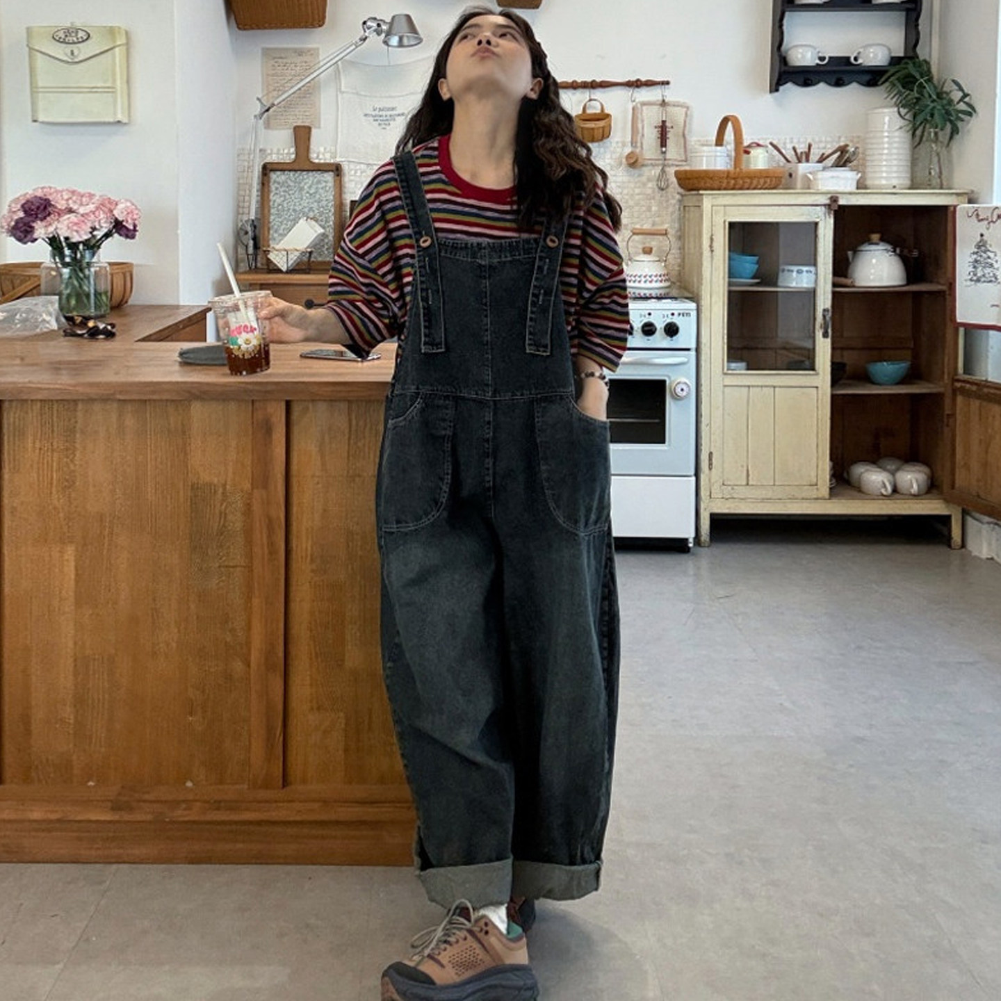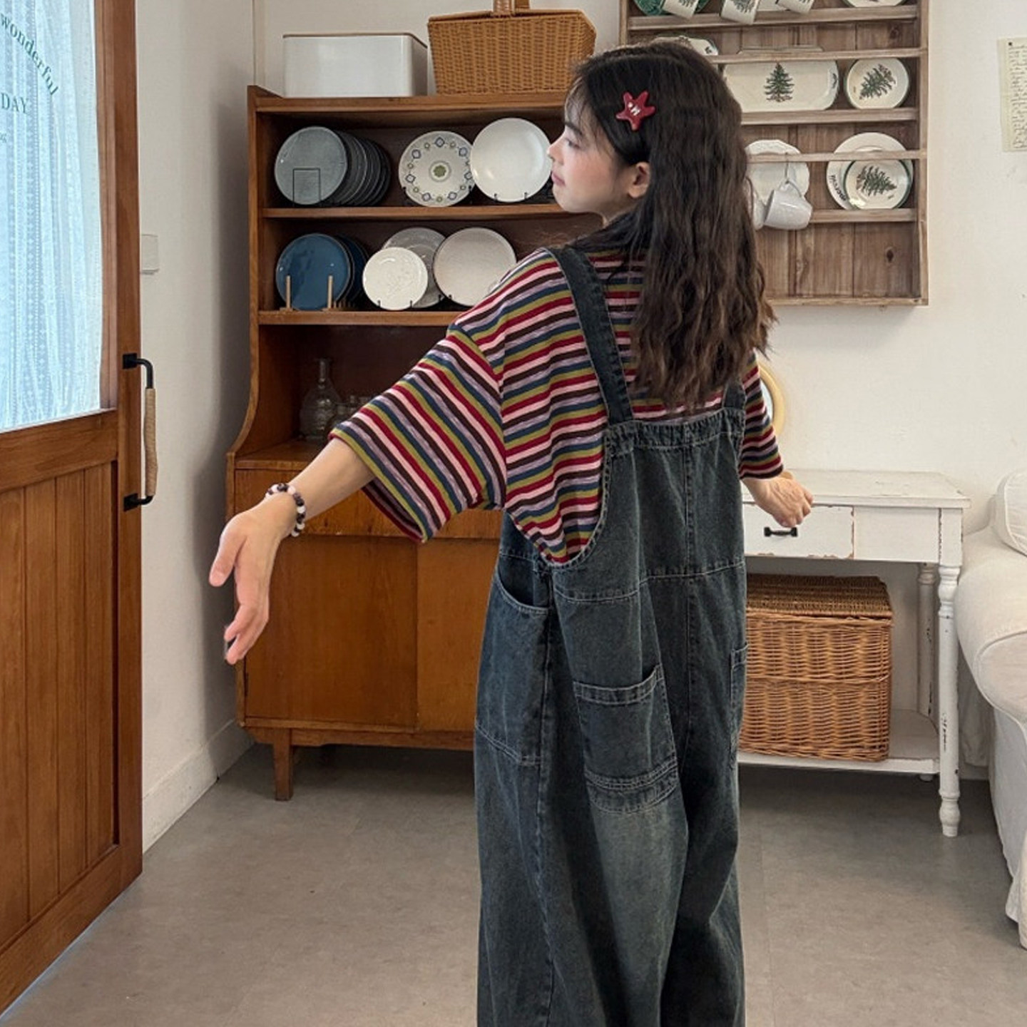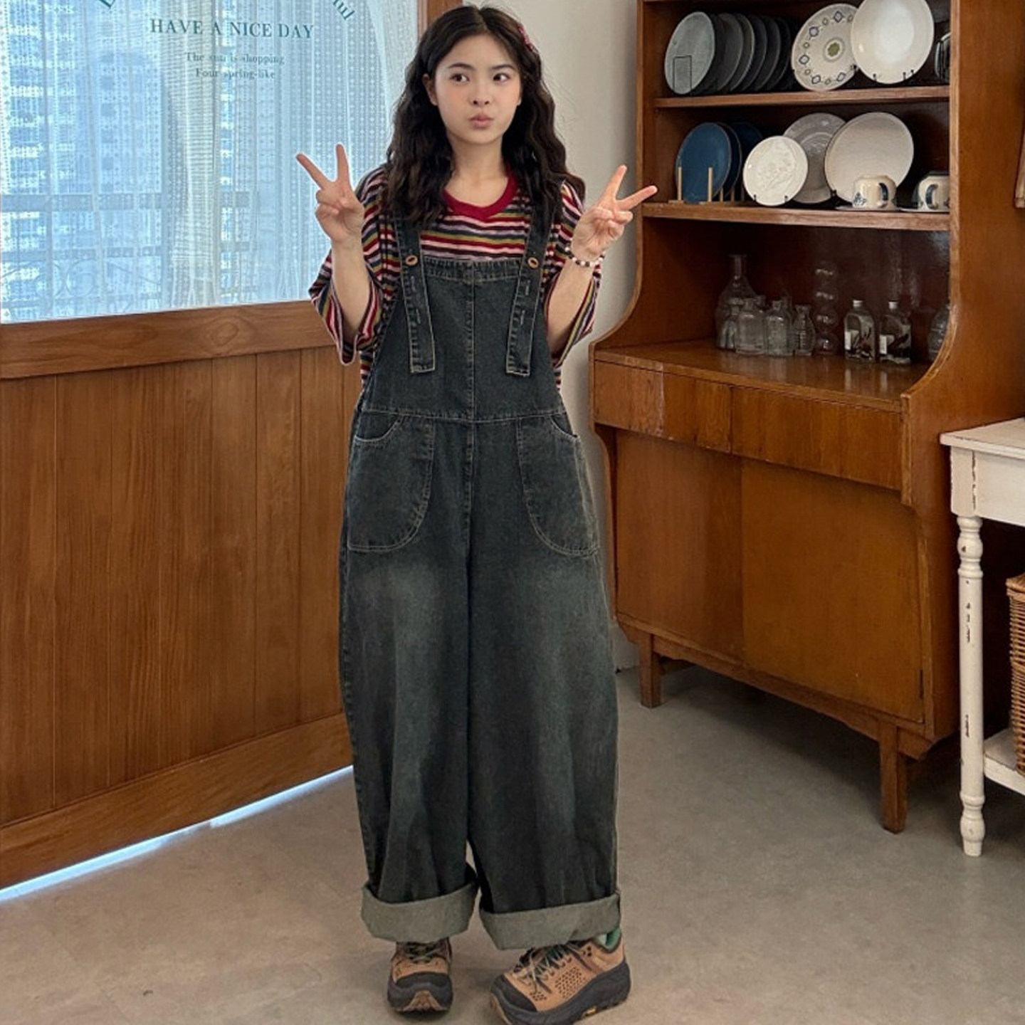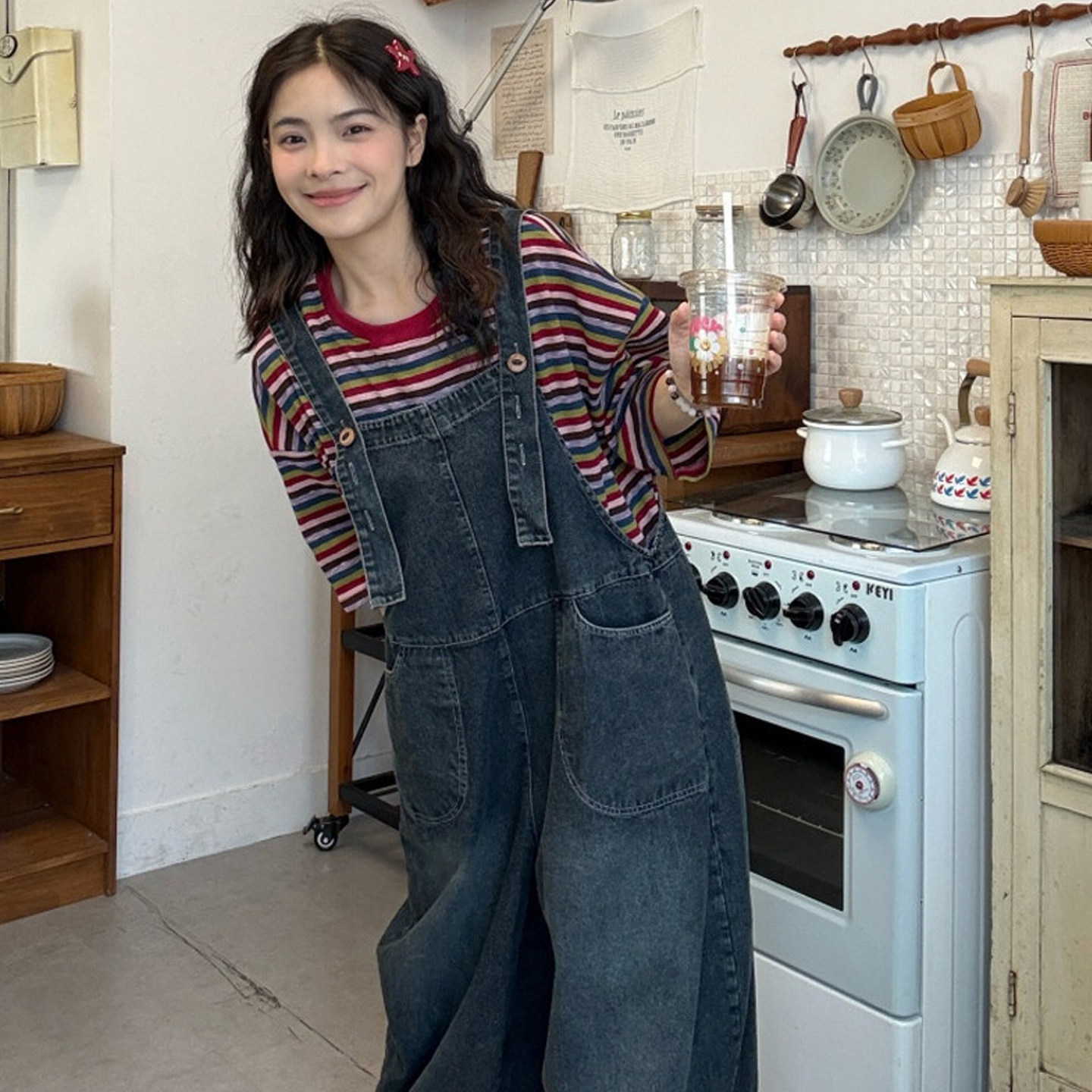 大码女装2026夏新款胖mm韩版彩虹条纹T恤+俏皮休闲牛仔背带裤套装