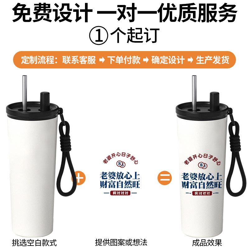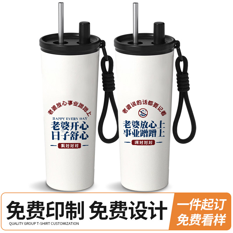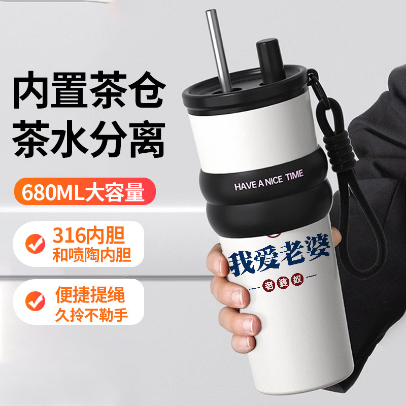 简约吸管保温杯创意文字宠我爱老婆趣味男款水杯带茶仓茶隔大容量
