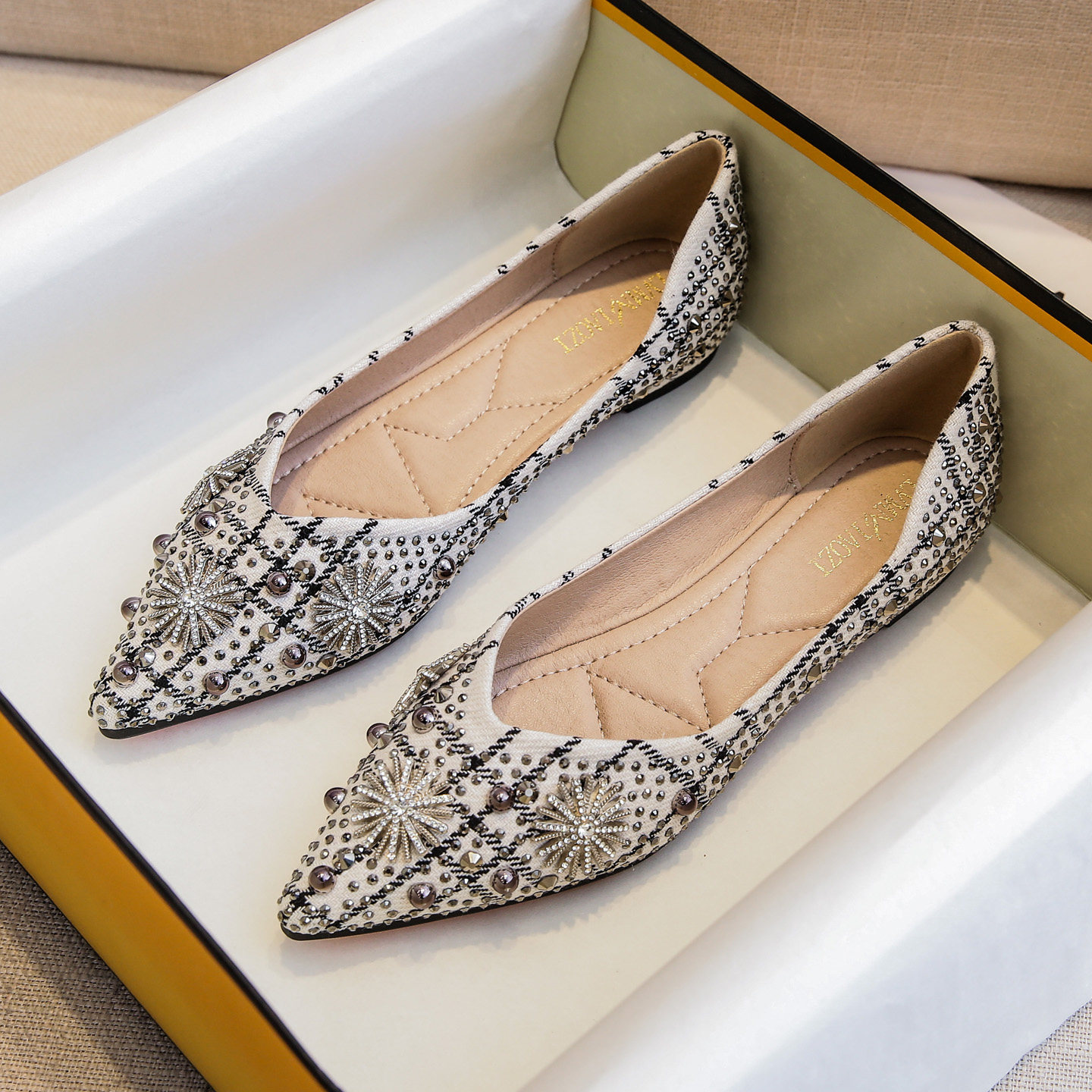 早春漂亮单鞋女2026新款尖头平底水钻四季软底大码瓢鞋41到43船鞋