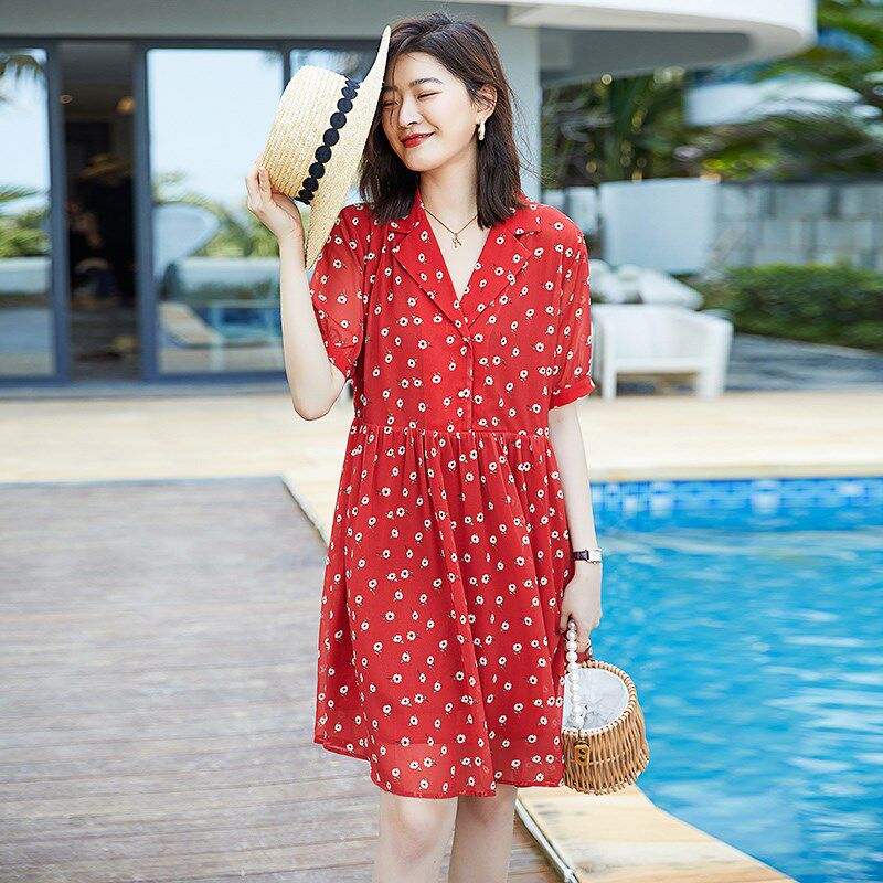 加大码连衣裙夏季胖mm遮肚显瘦红色减龄短袖高级感A字碎花雪纺裙