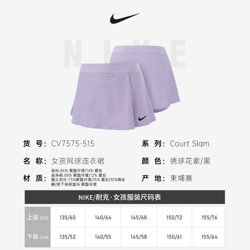 Nike耐克儿童网球服女童青少年运动短裙内置底裤防走CV7575-515