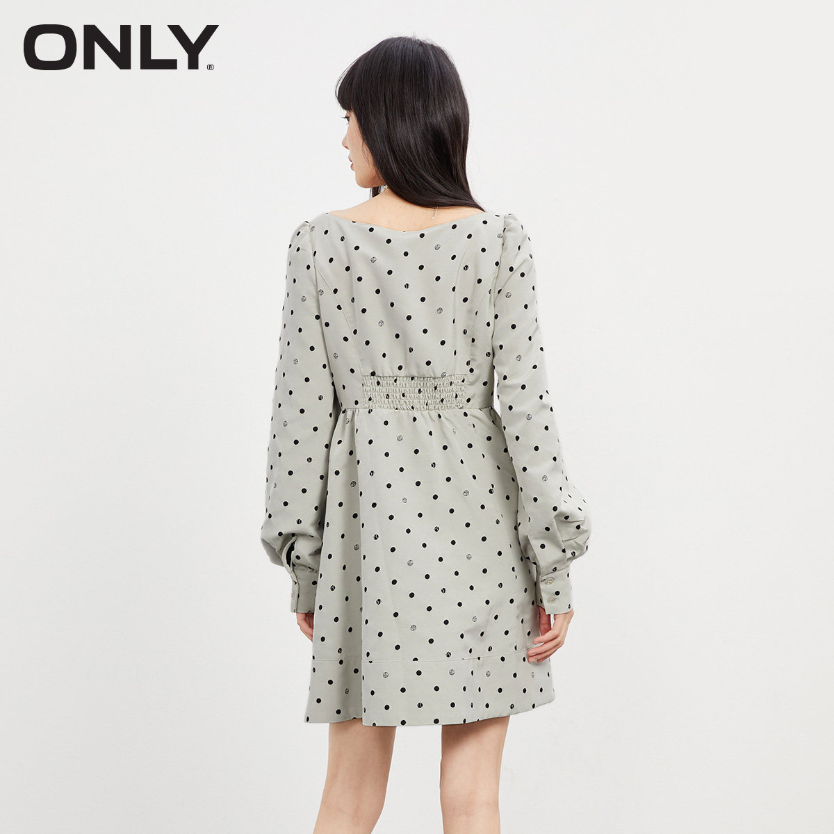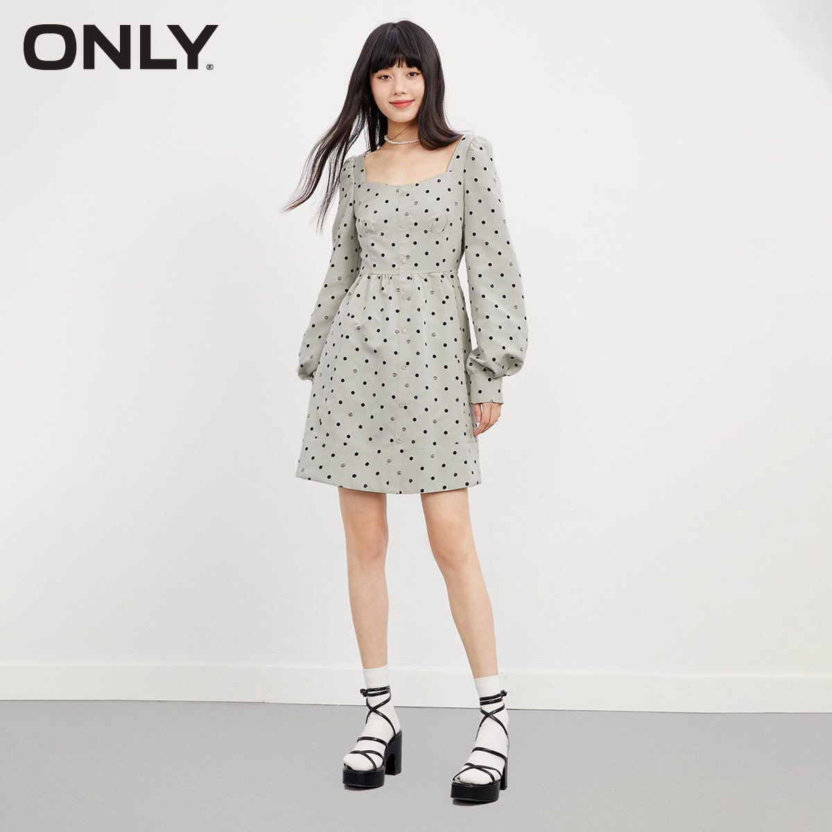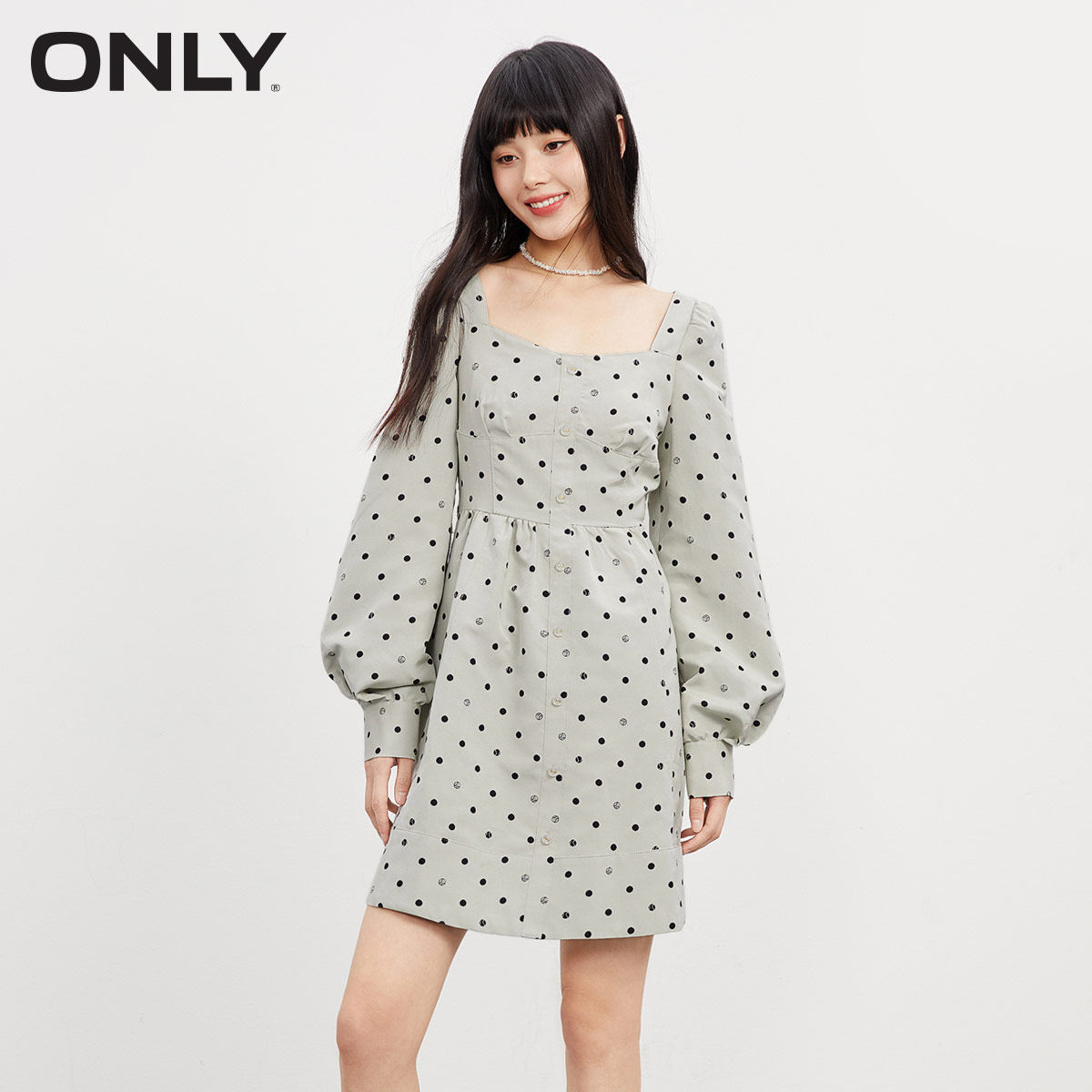 【ONLY奥莱】春季新款潮流方领波点高腰长袖短款连衣裙女