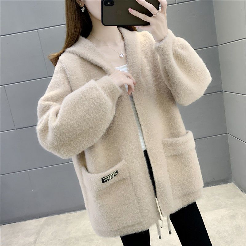 网红毛衣仿水貂绒连帽开衫外套女秋冬韩版宽松大码加厚洋气慵懒风