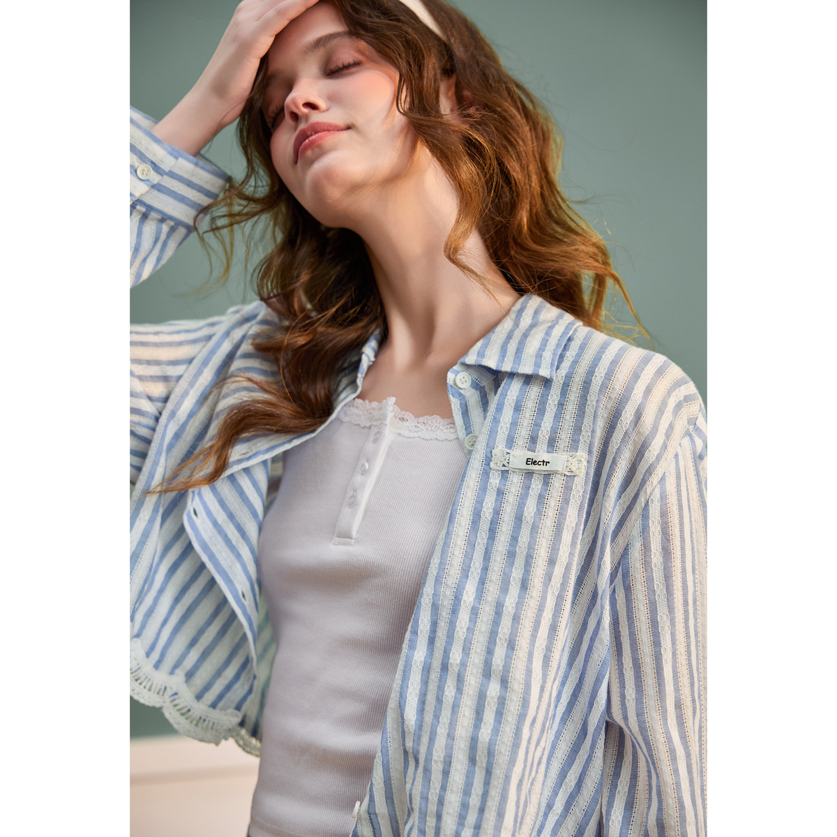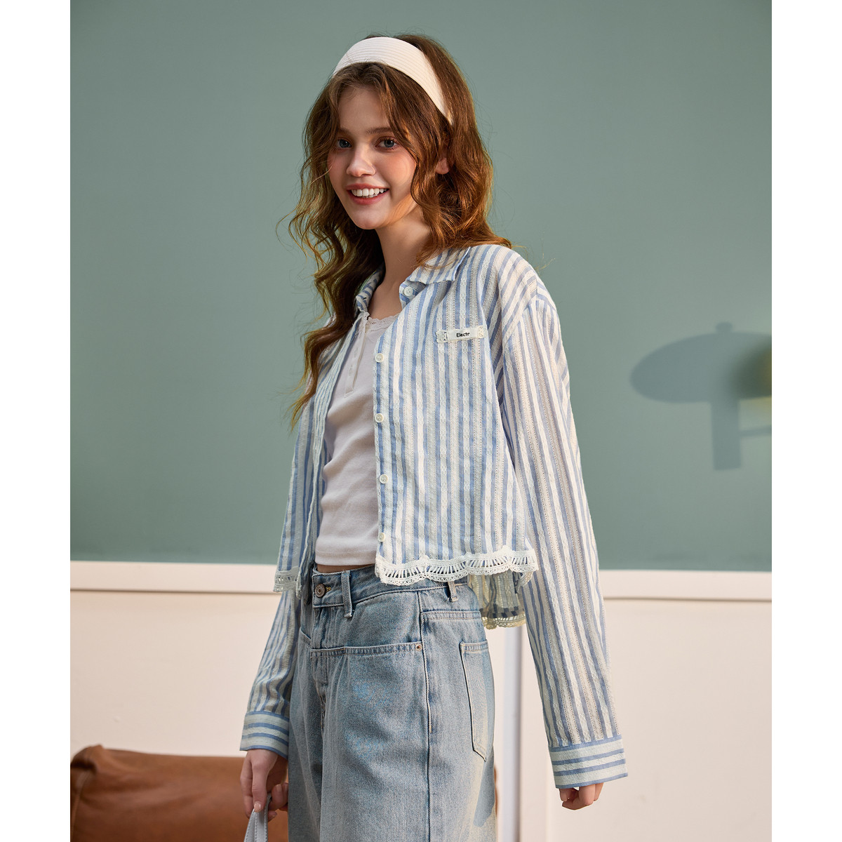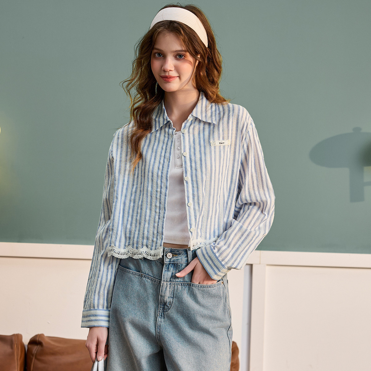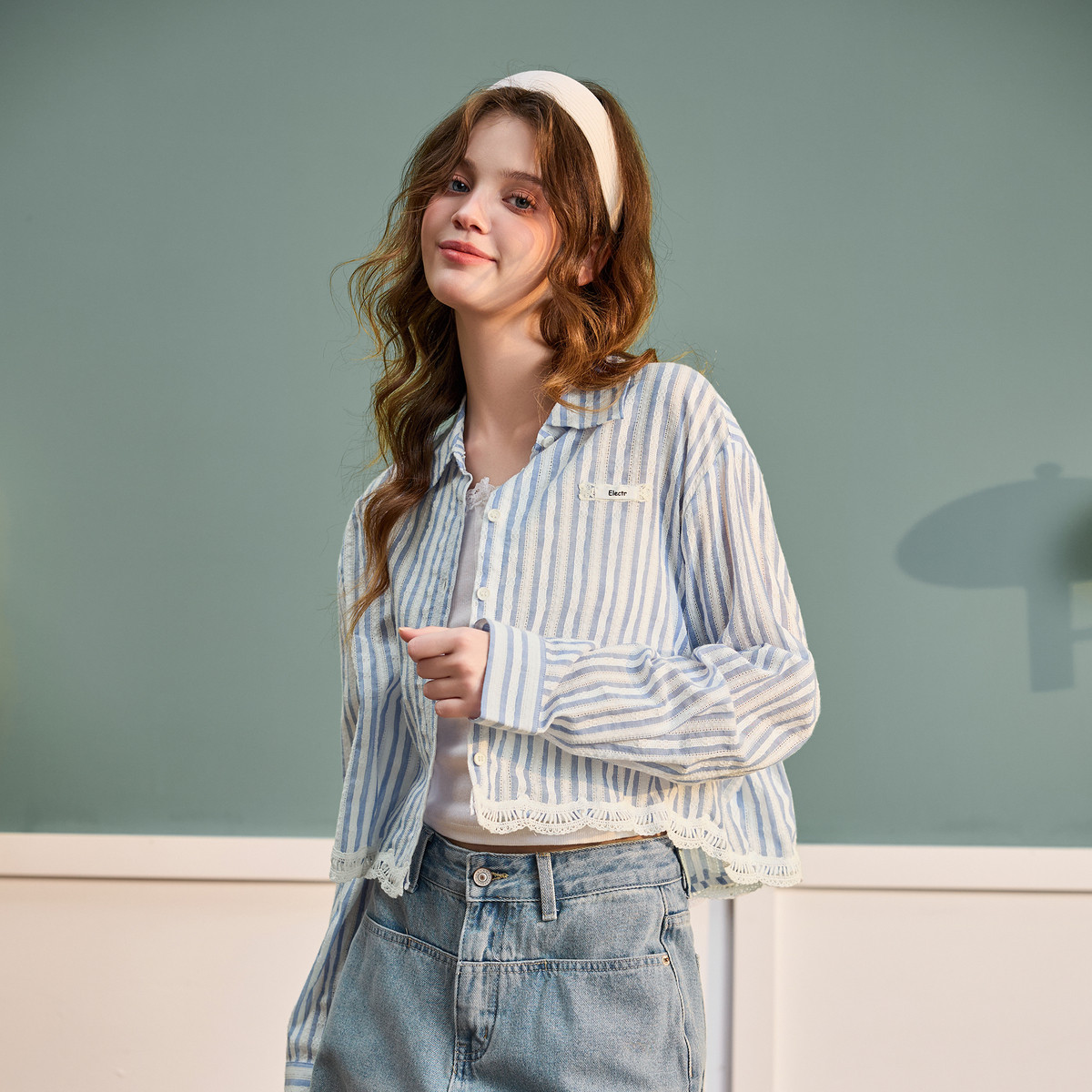 唐狮春季长袖衬衫女款2026新款条纹短款宽松蕾丝花边外套洋气上衣
