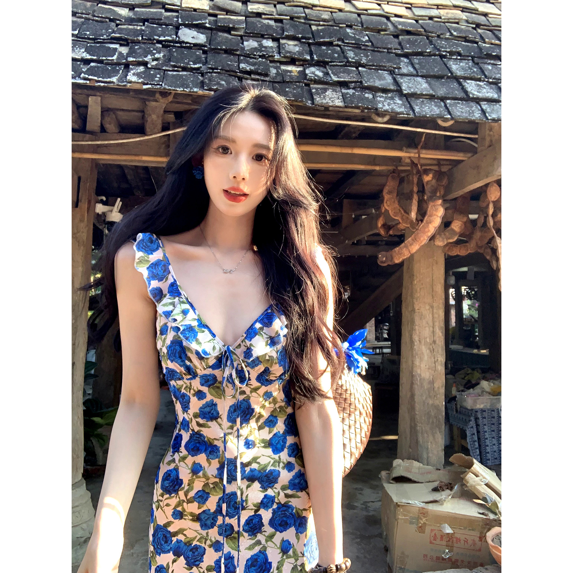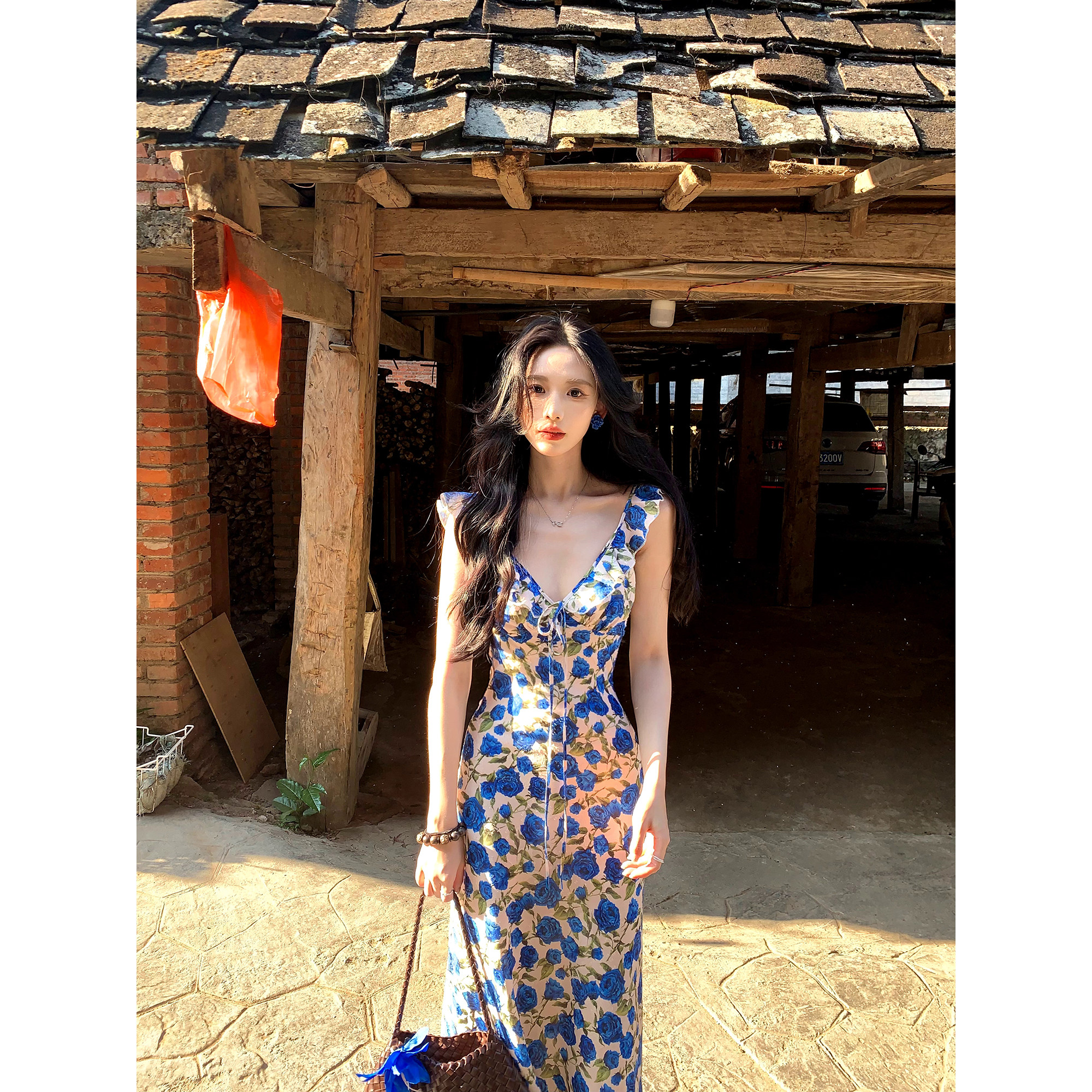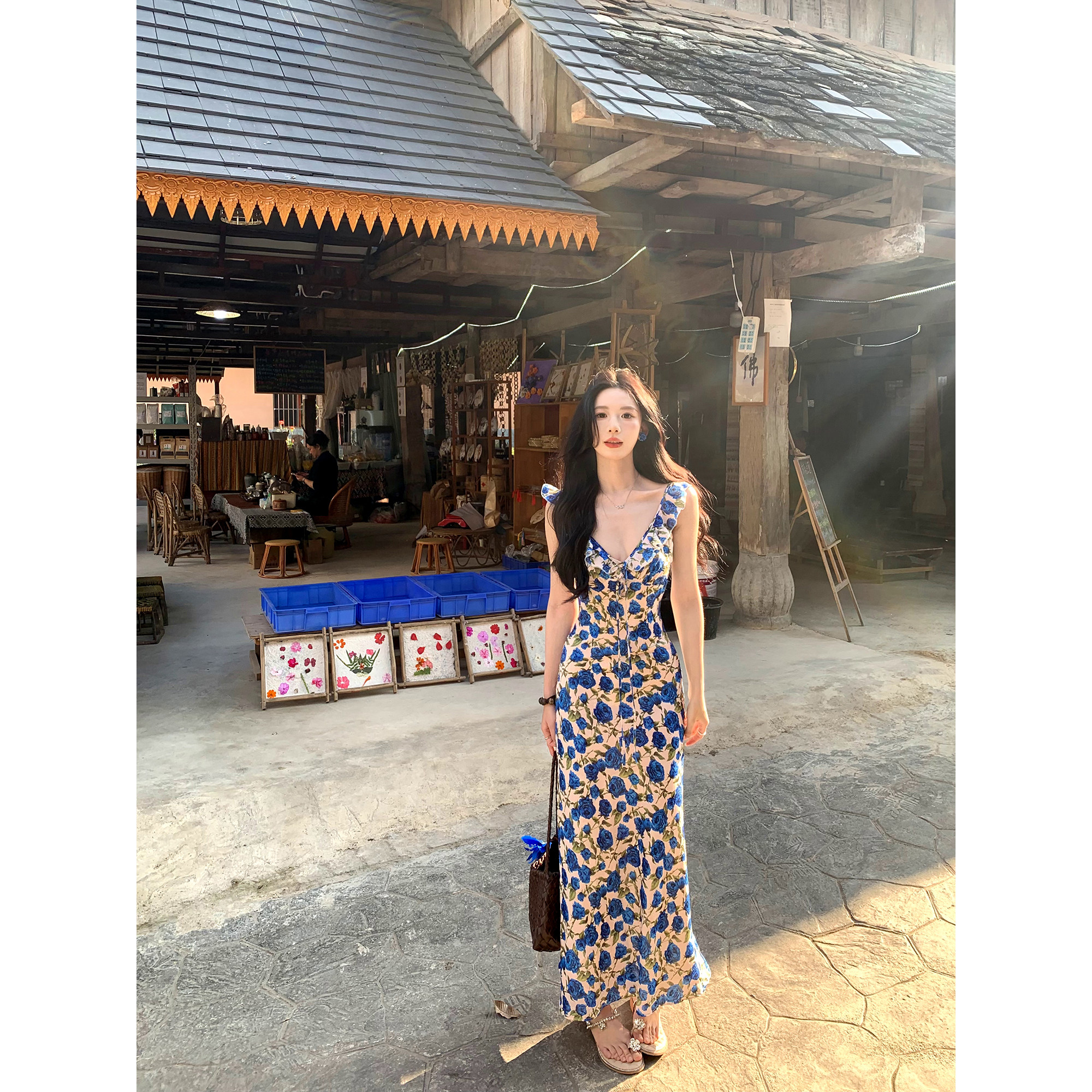 一颗甜桃yikett《克莱因蓝》V领碎花吊带连衣裙女夏季度假风长裙