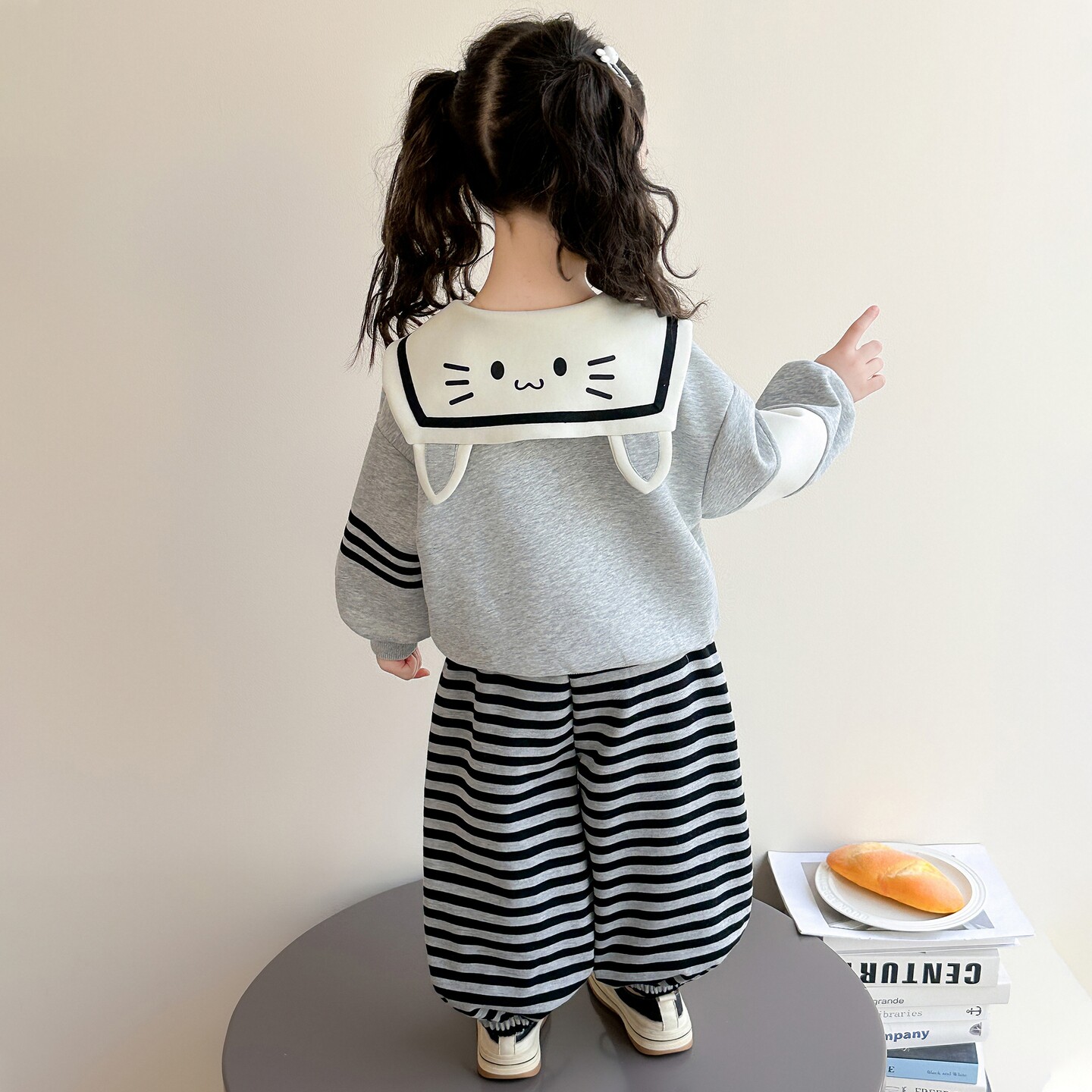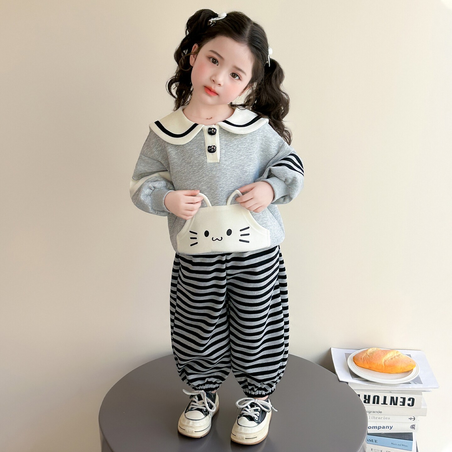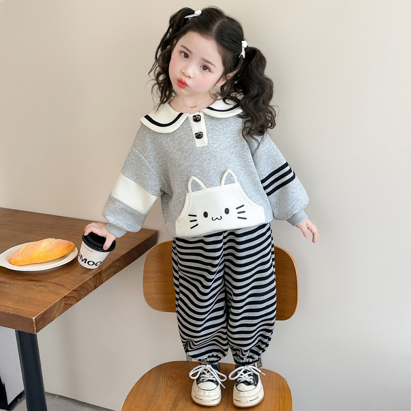 女童春装韩版套装2026新款女孩娃娃领卡通卫衣两件女宝宝衣服春秋