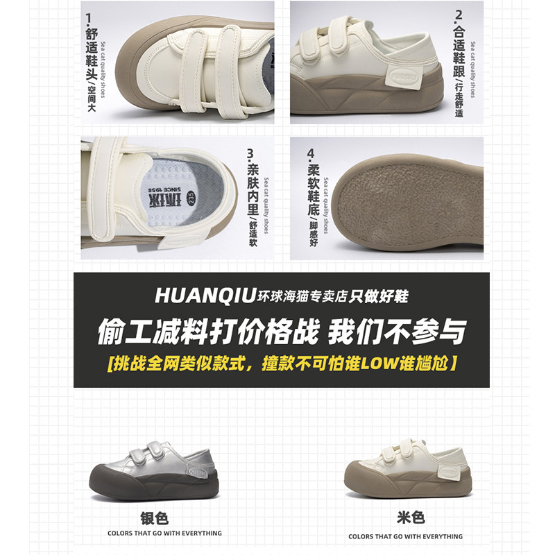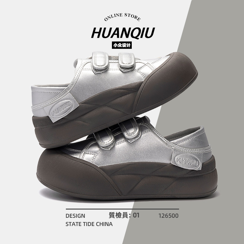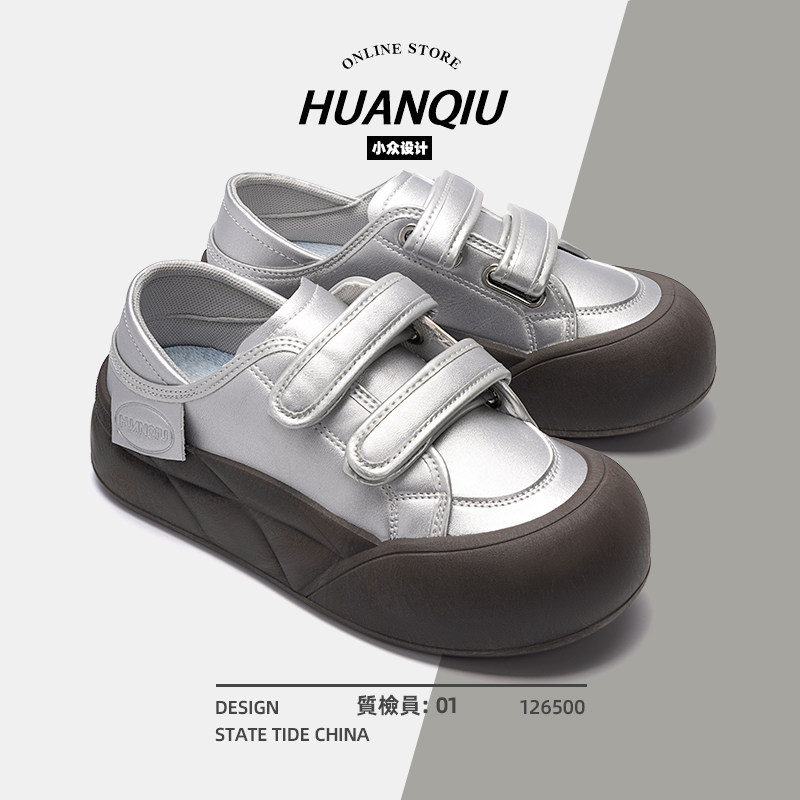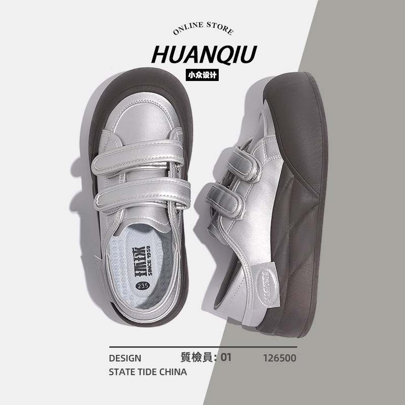 环球银色板鞋女款2025新款春秋款百搭魔术贴大头女鞋厚底增高鞋子