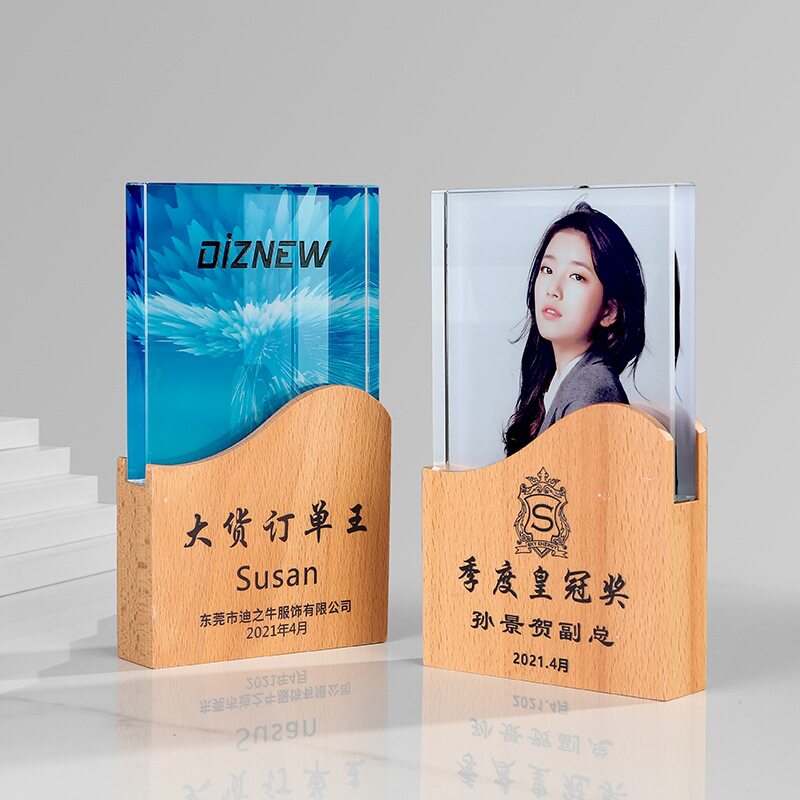 实木带照片奖杯加工创意水晶彩印年会员工颁奖高端纪念品加工