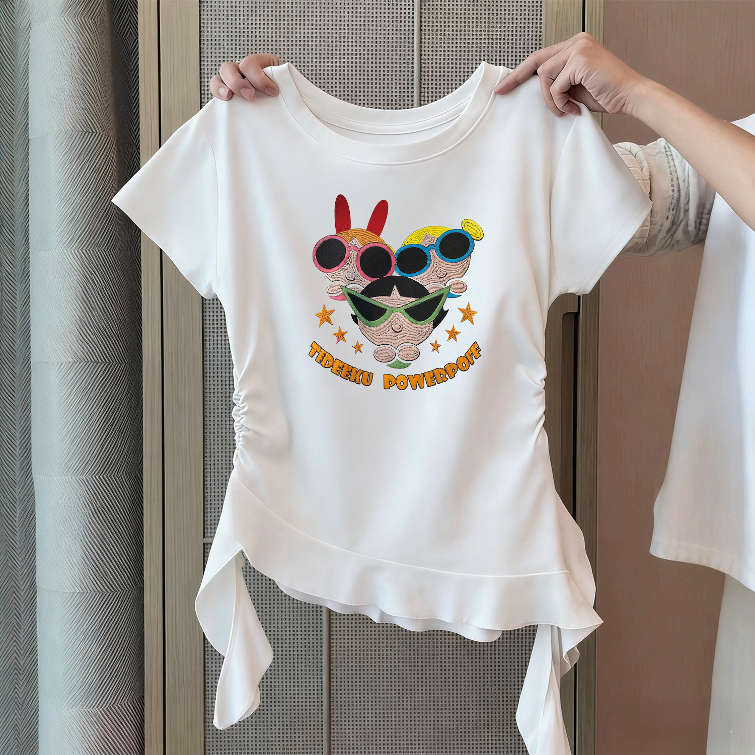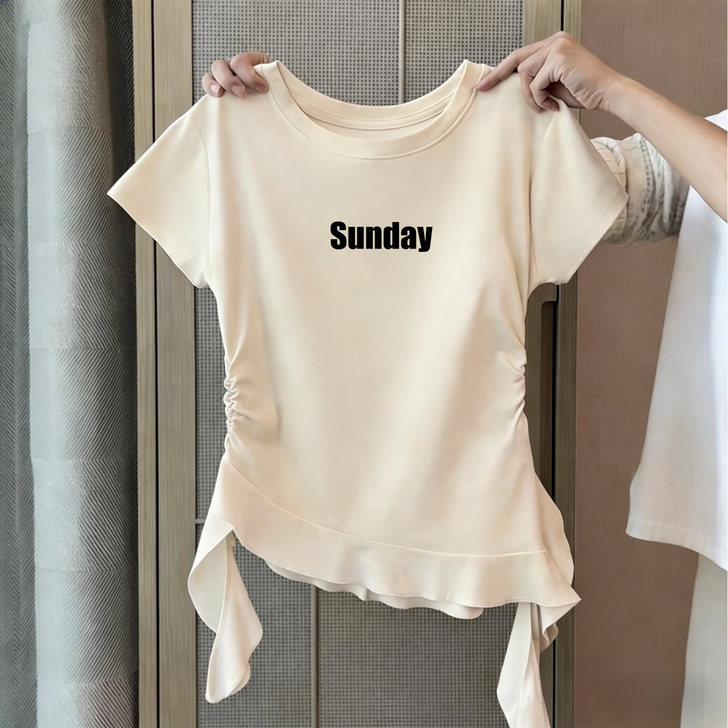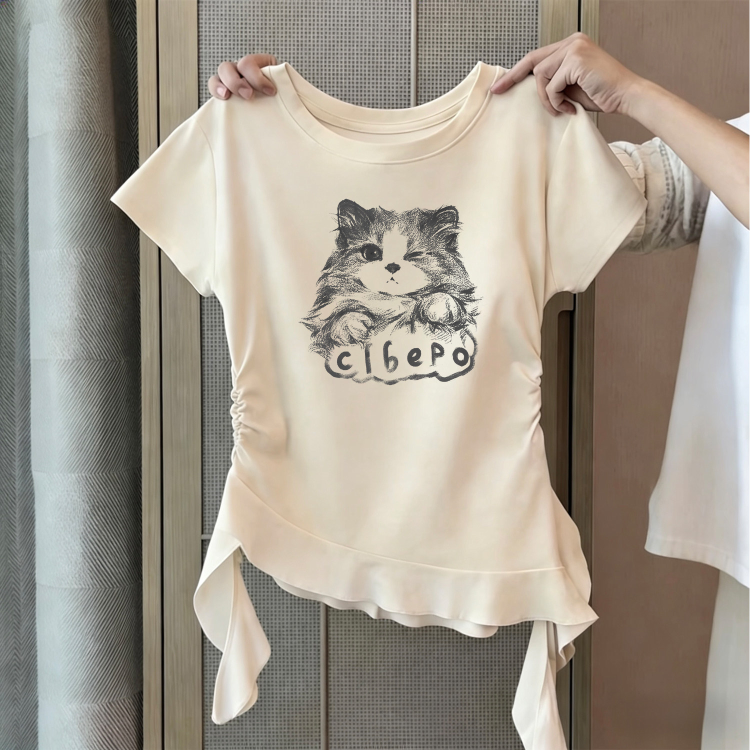 女童夏装2026新款圆领纯棉短袖T恤儿童夏季不对称荷叶边上衣短款