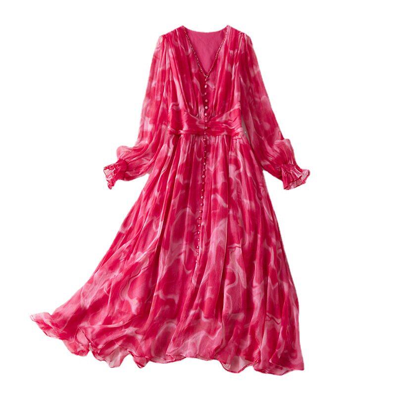 女装真丝连衣裙长袖法式v领桑蚕丝长款沙滩裙86050
