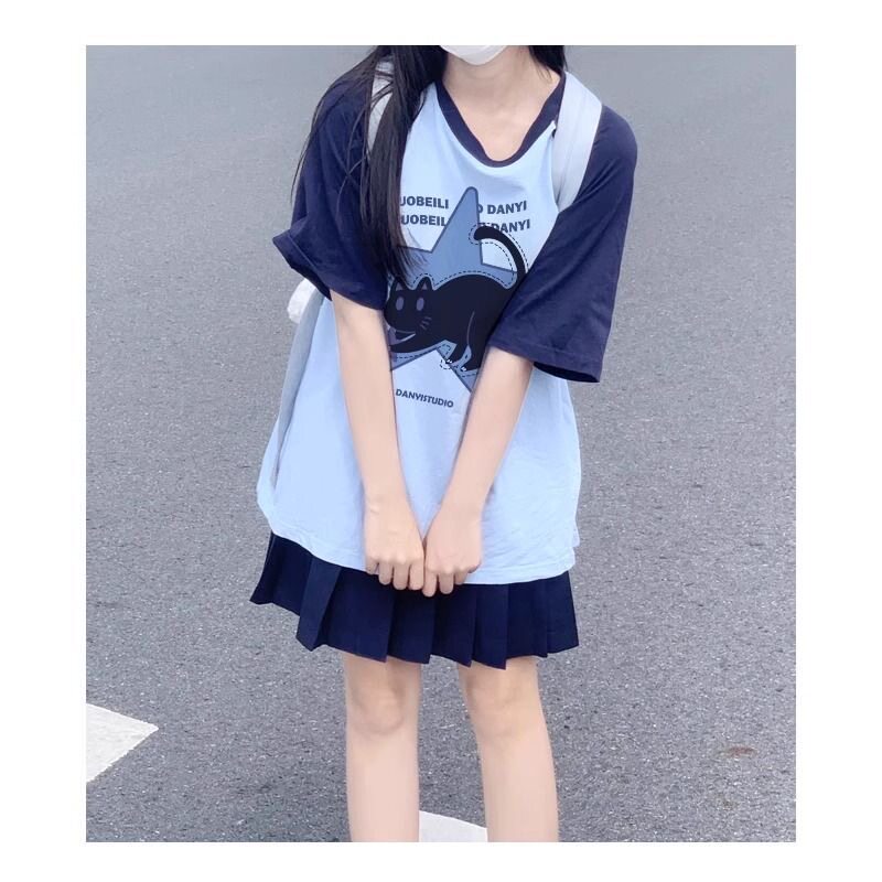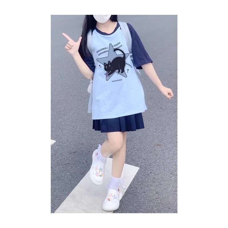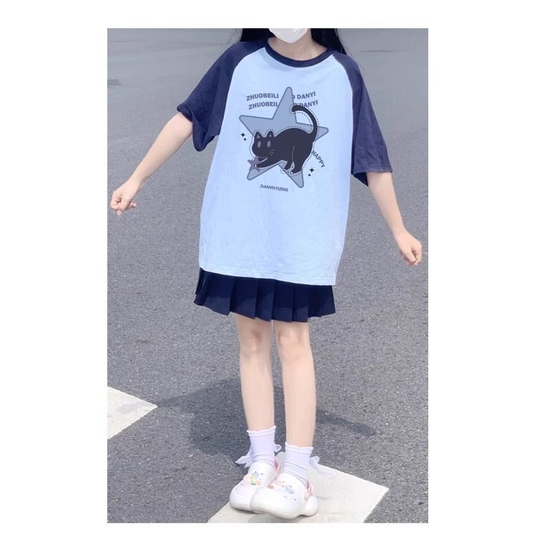 少女插肩短袖t恤女夏季2026新款初中学生印花薄款韩版宽松短上衣