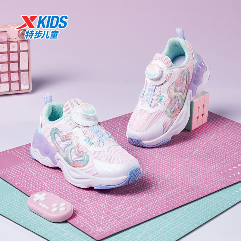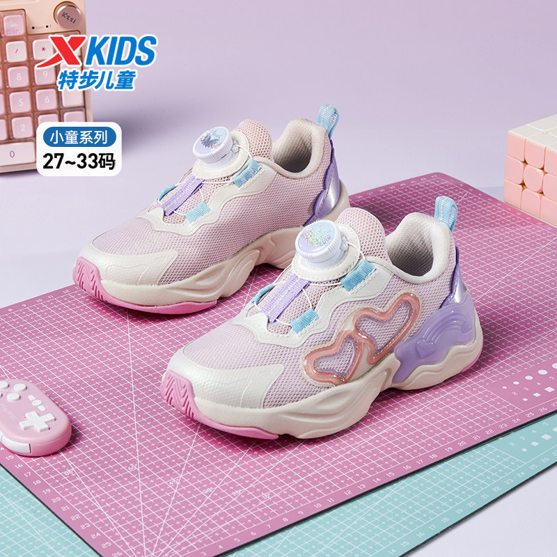 特步女童鞋2026春季新款网面透气儿童运动鞋旋转纽扣女孩休闲鞋子