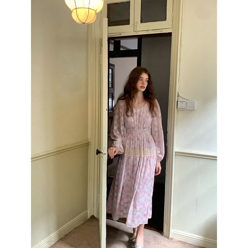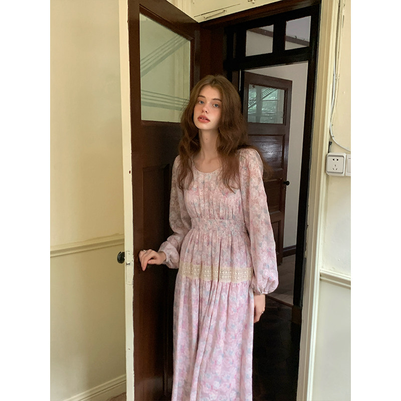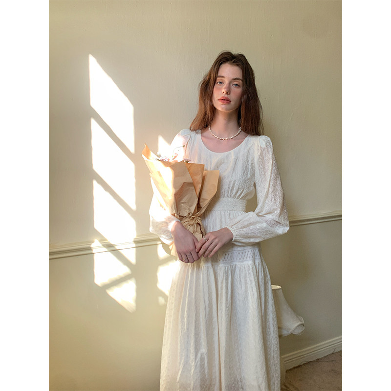 竹依依 赫本的花园 法式镂空绣花秋冬连衣裙中长款气质圆领A字裙