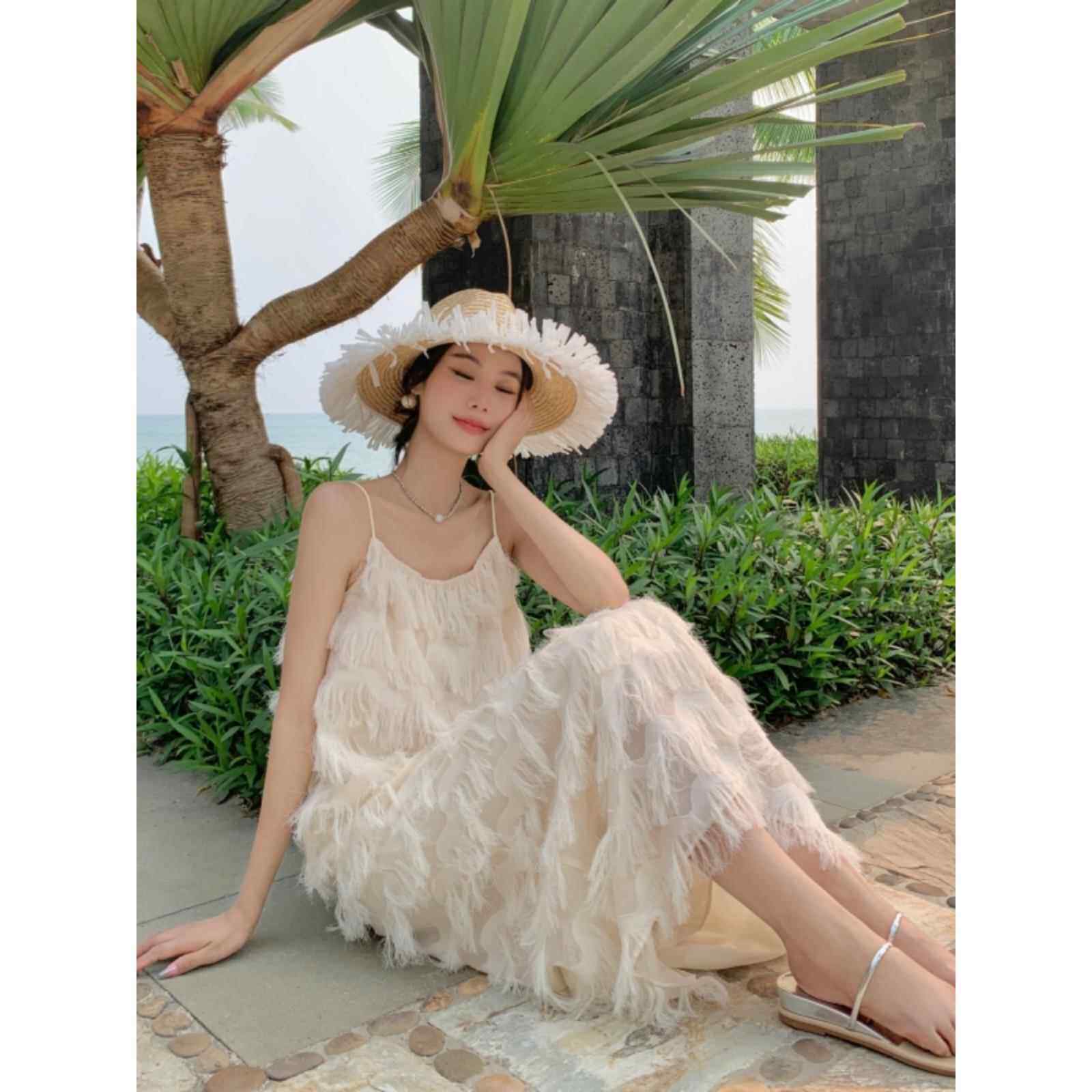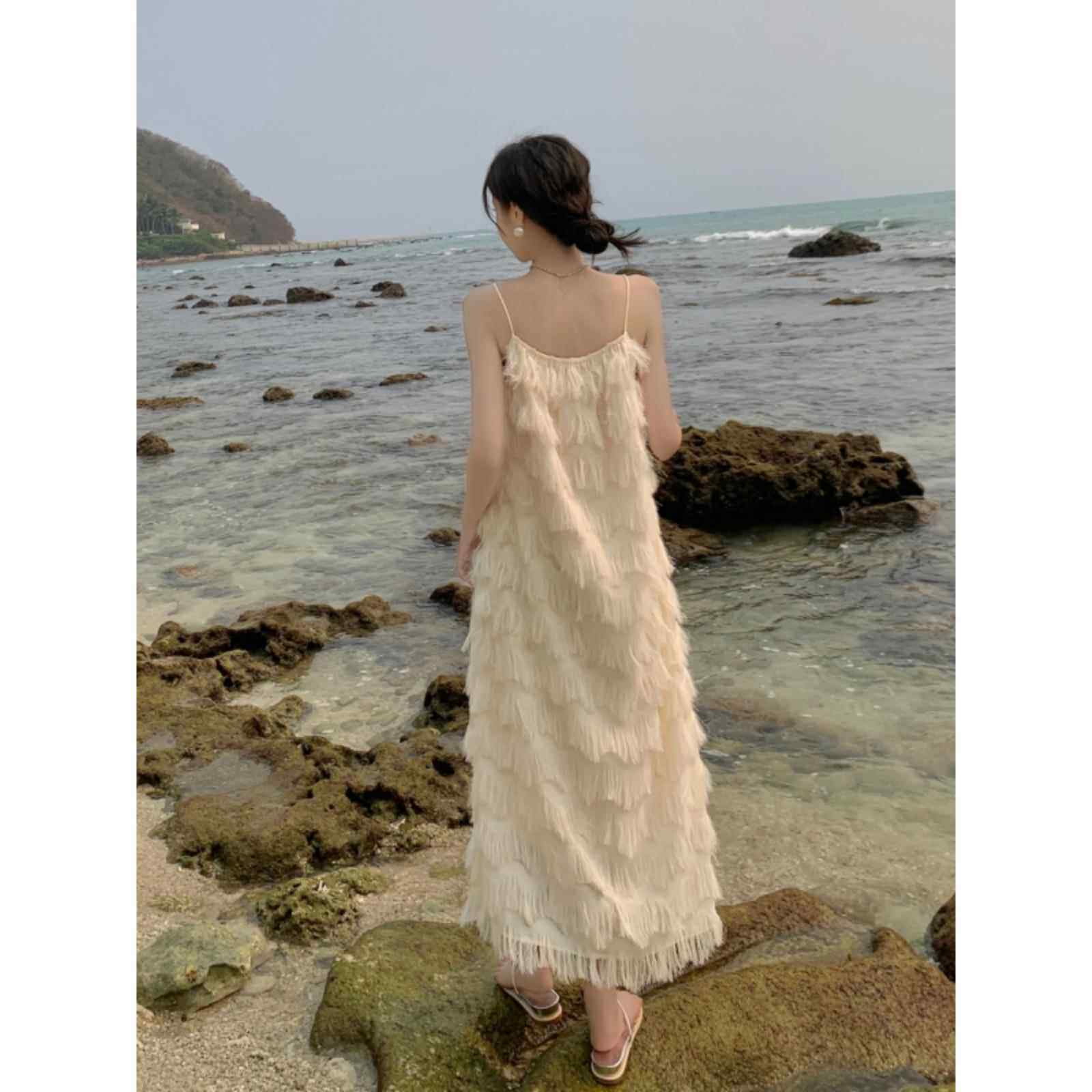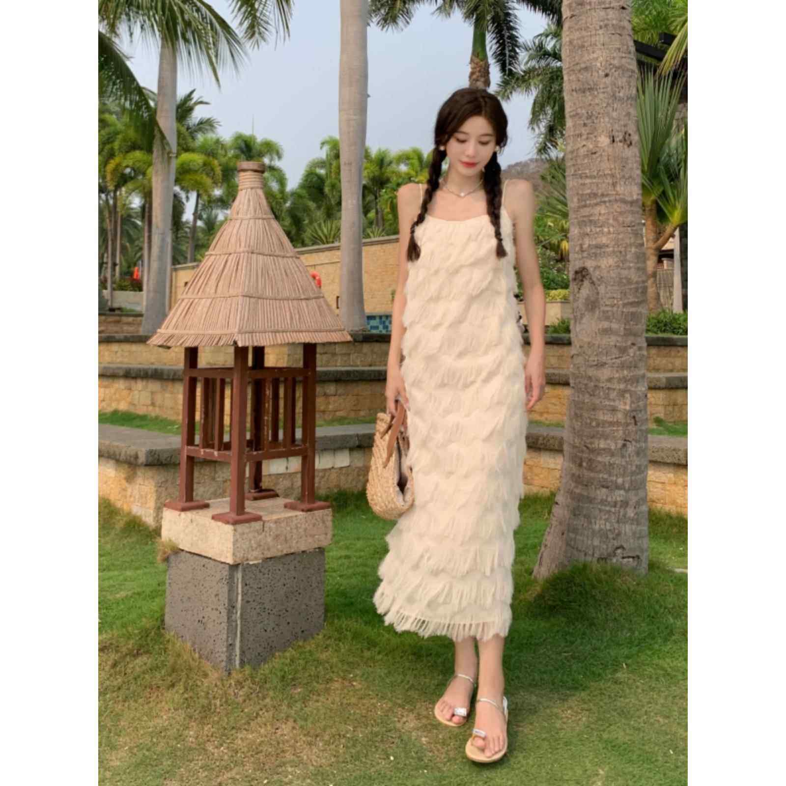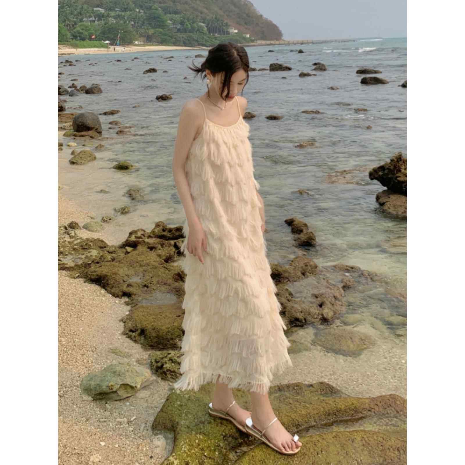 夏季白色吊带连衣裙女小个子流苏蛋糕裙三亚海边度假沙滩裙0409r1