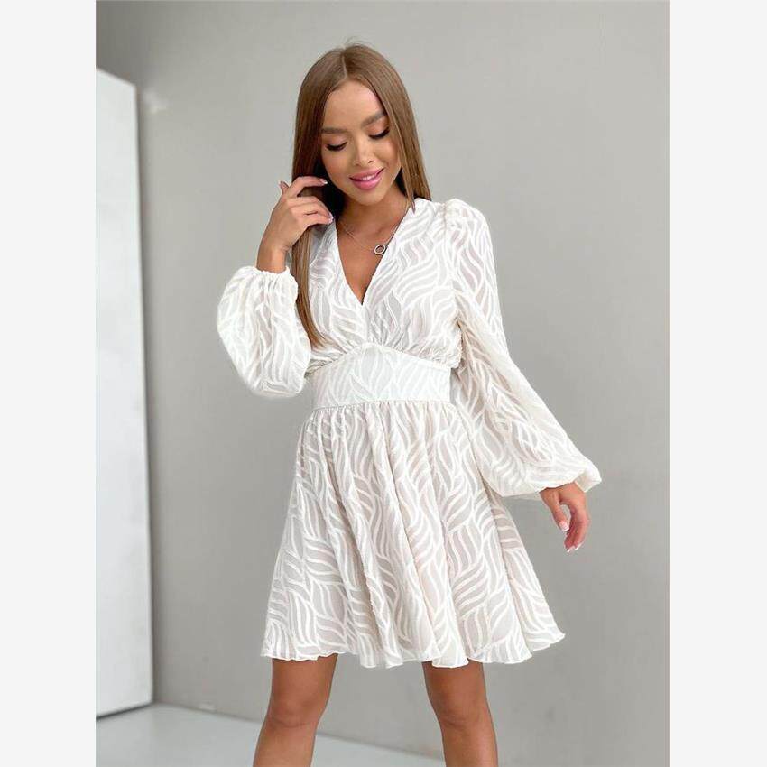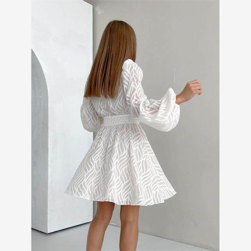 2023春季欧美气质白色镂空提花灯笼长袖连衣裙时尚收腰短款A字裙