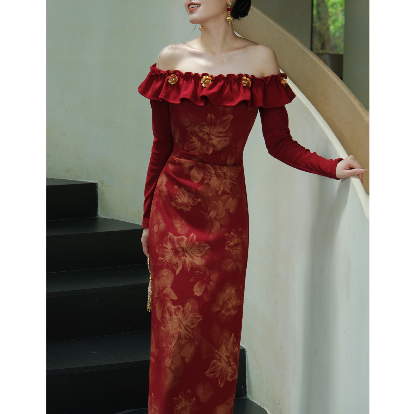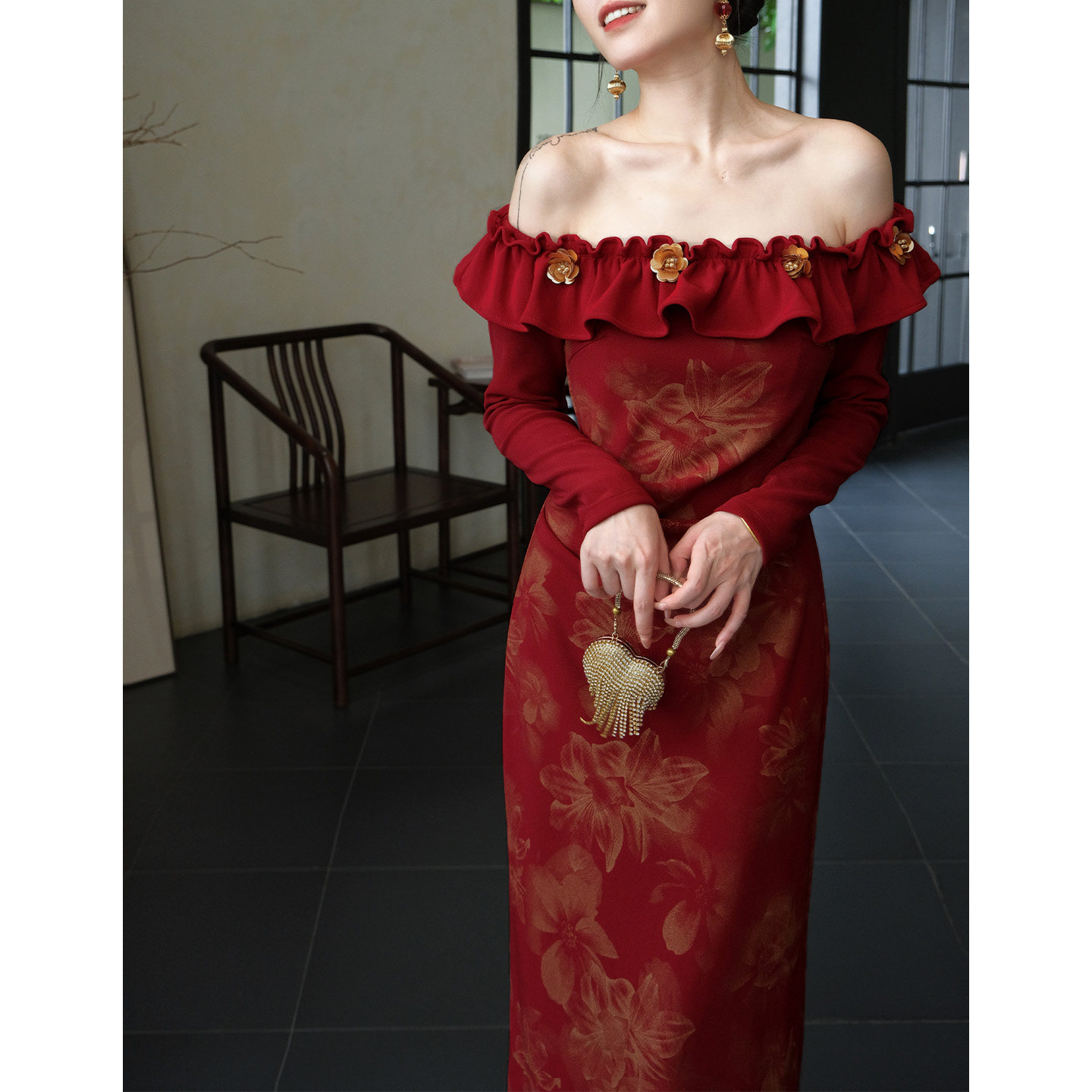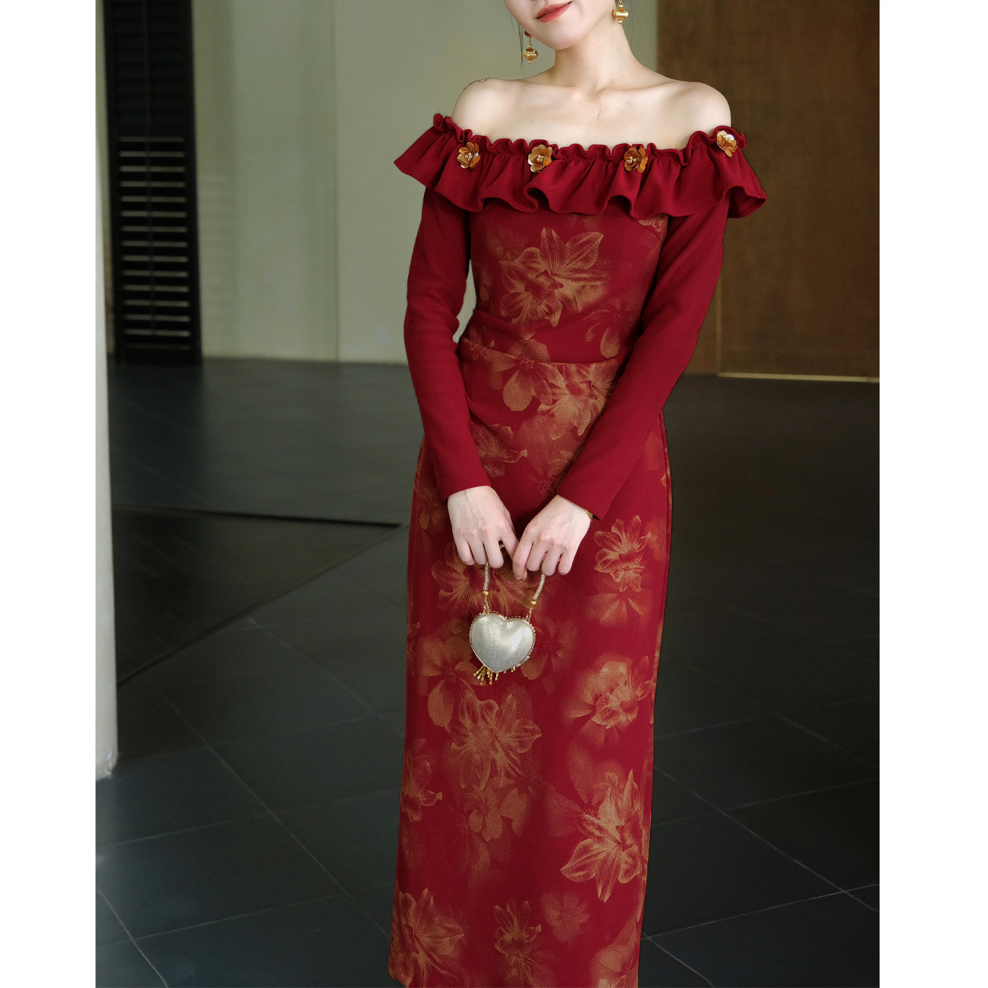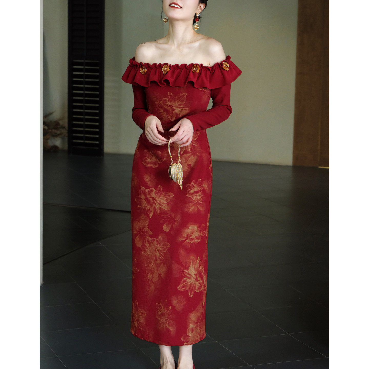 鹿与玫瑰法式复古红色连衣裙一字肩气质修身长袖礼服裙子女敬酒服