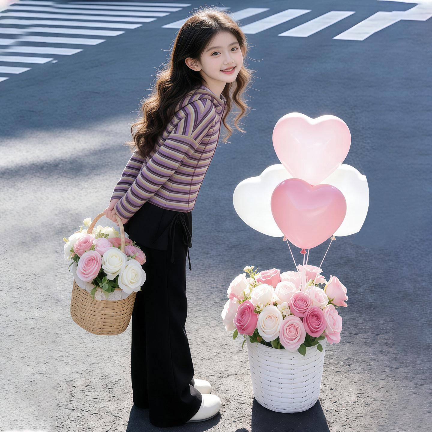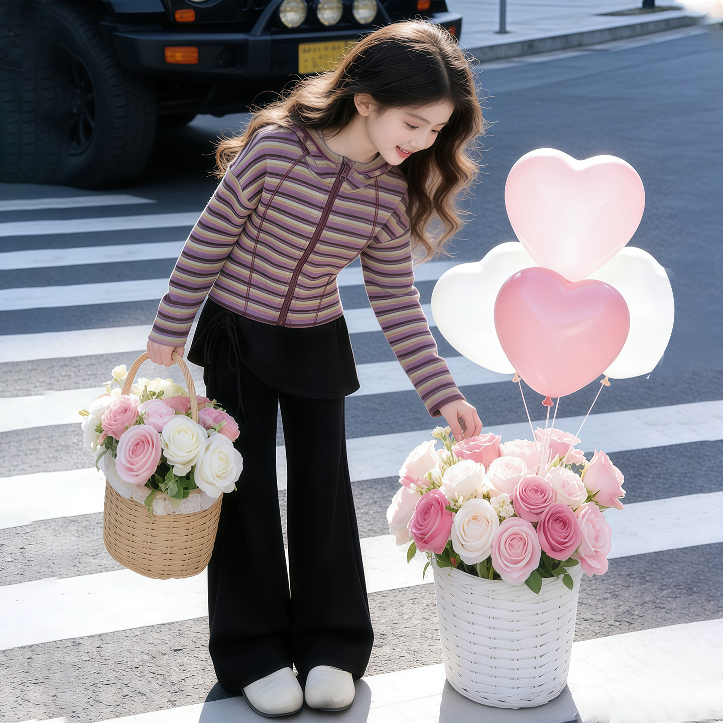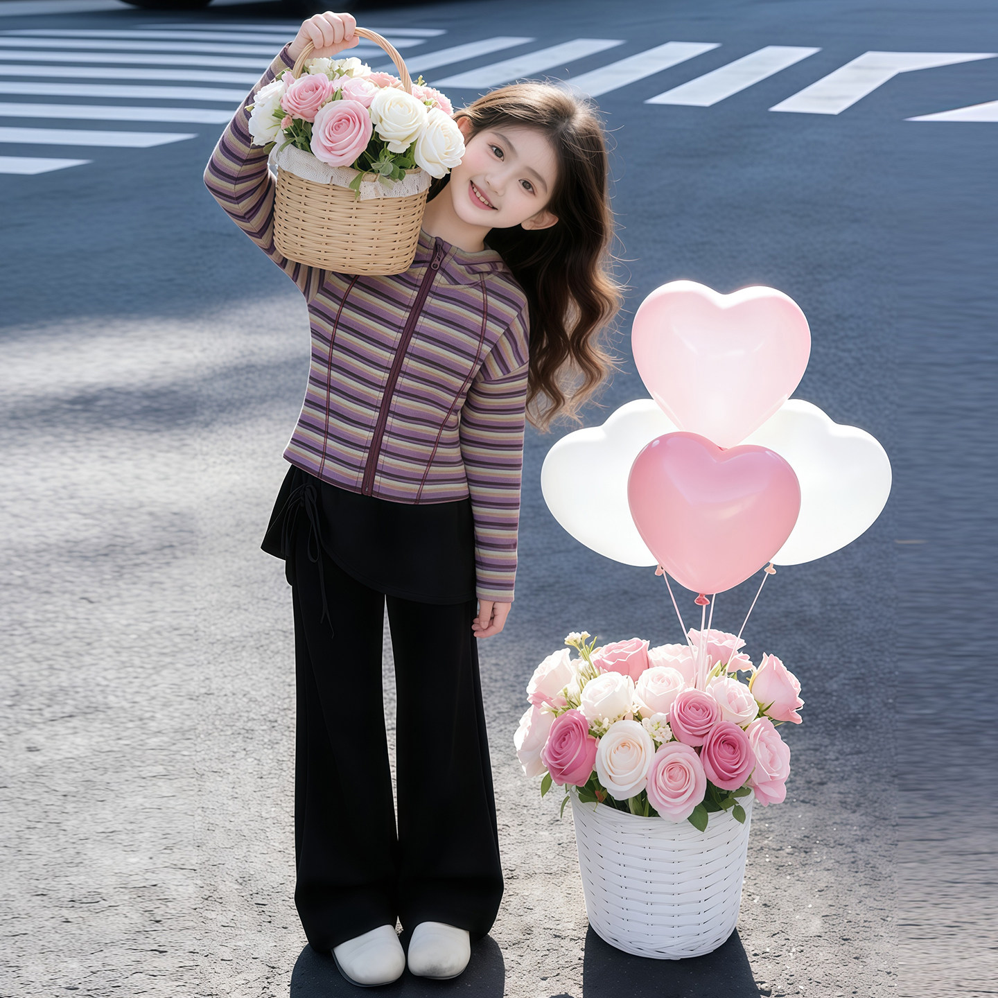 女童春款连帽上衣套装2026春季新款女宝条纹卫衣微喇裤两件套洋气