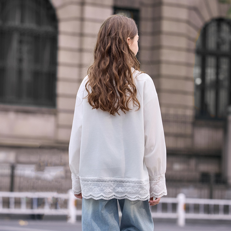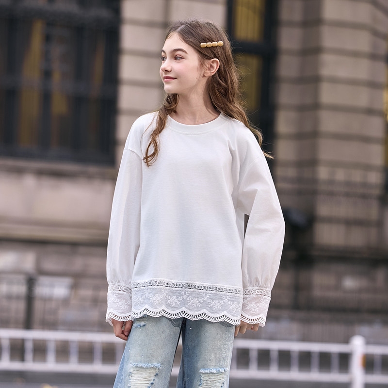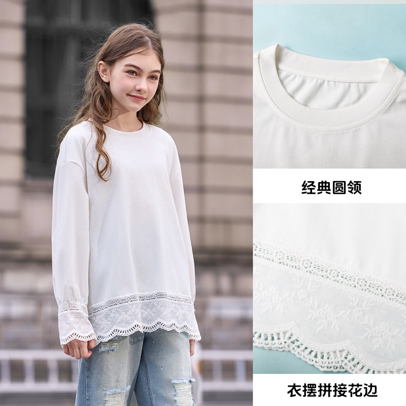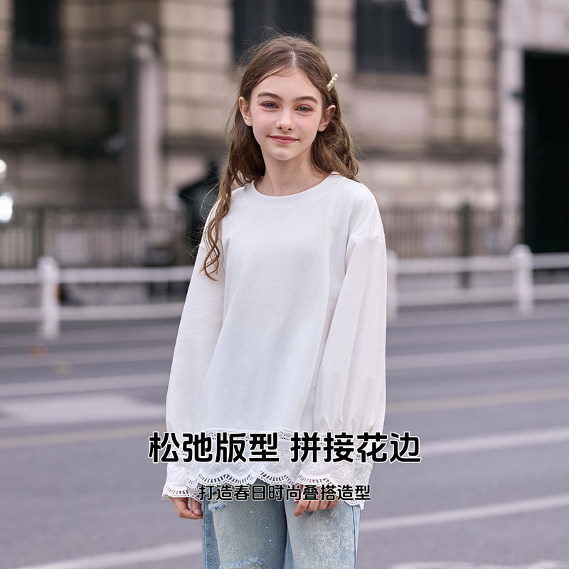 女大童白色t恤2026新款青少年洋气纯棉蕾丝打底衫青少年女孩长袖