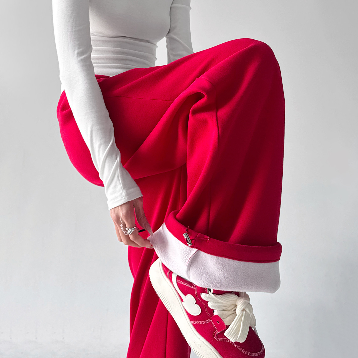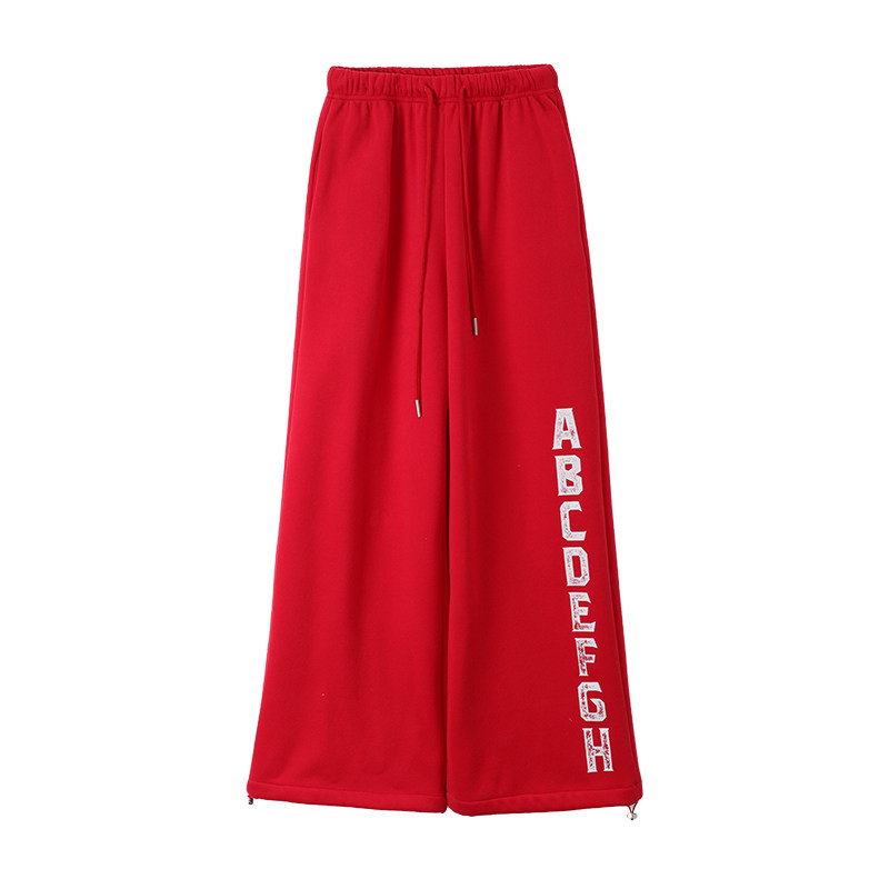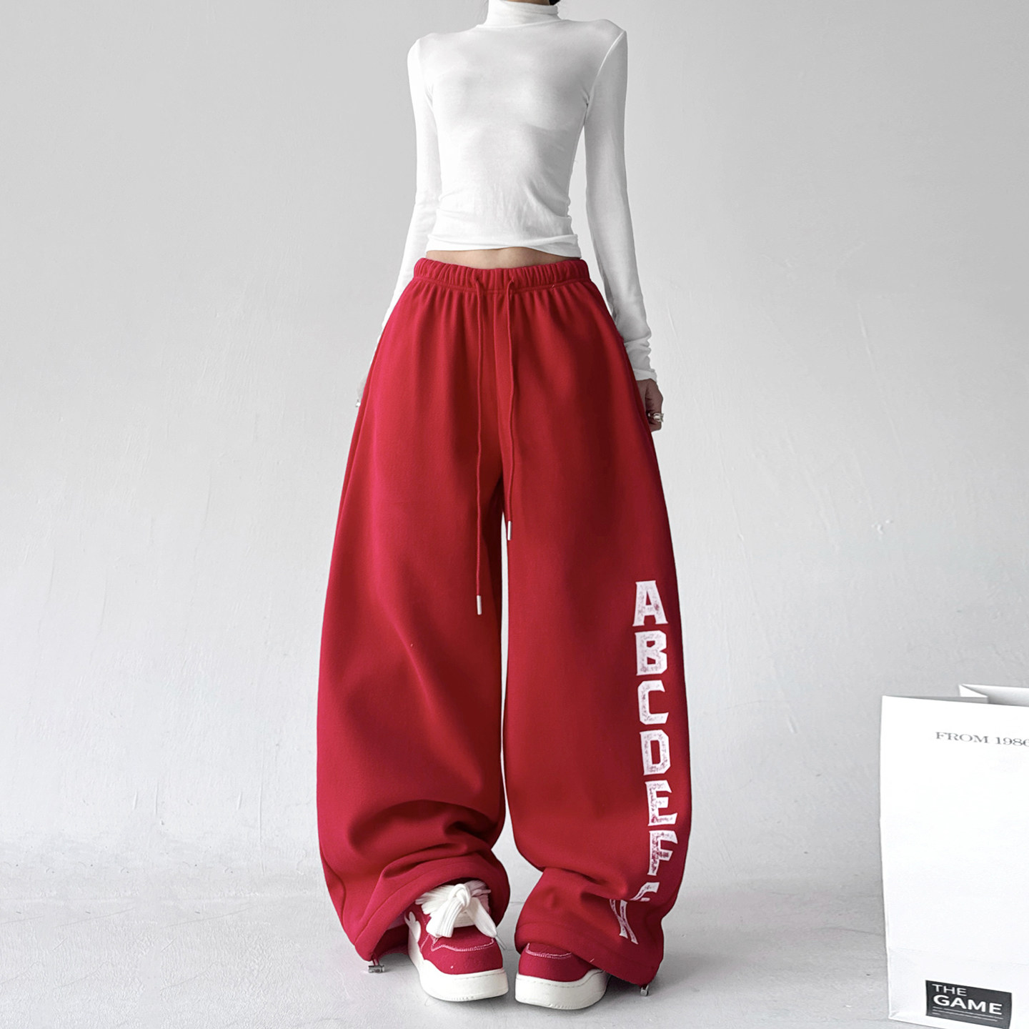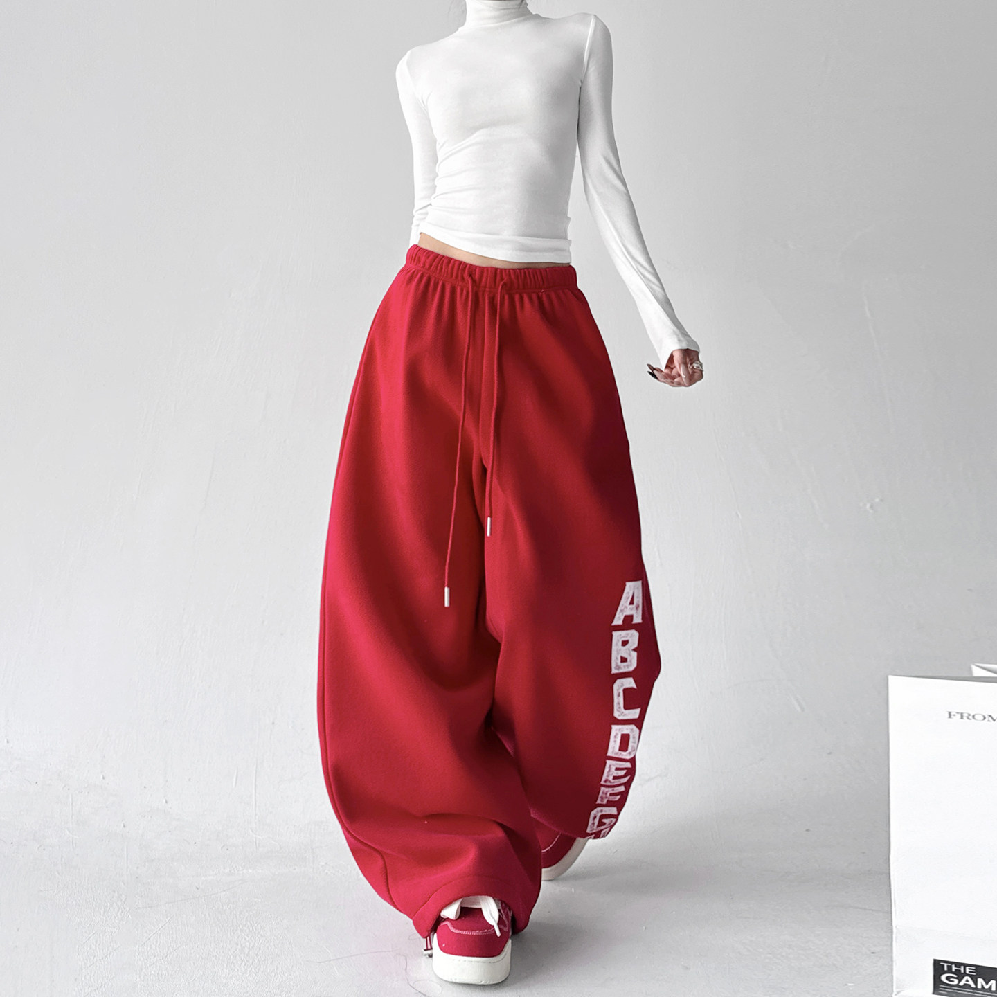 今年流行红色嘻哈印花阔腿裤裤子女款2026冬季新款加绒运动卫裤