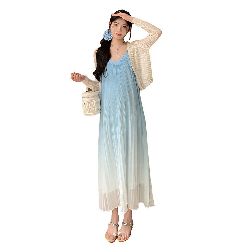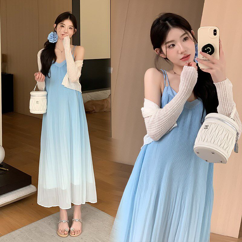 大码孕妇连衣裙夏季渐变百褶长裙海边度假雪L纺吊带裙两件套200斤