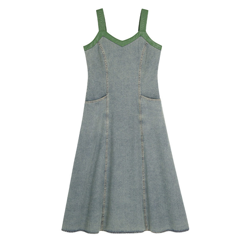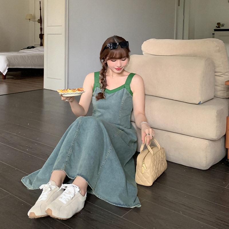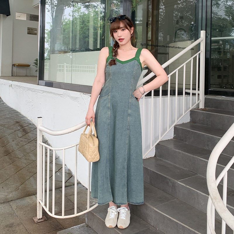 大码气质港风撞色牛仔连衣裙夏大码胖mm高腰遮肚显瘦吊带裙63393